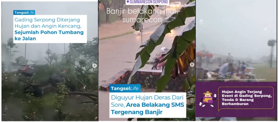 Berdasarkan informasi dari sosial media dan laporan grup whatsapp, telah terjadi kejadian cuaca ekstrem berupa hujan sedang hingga lebat pada siang hingga sore hari di sebagian besar wilayah Provinsi Banten. Kondisi tersebut menyebabkan dampak meliputi genangan/banjir dan pohon tumbang di Kawasan Gading Serpong, Kec. Kelapa Dua, Kabupaten Tangerang dan Kawasan Perumahan Binong Permai, Kec. Curug, Kabupaten Tangerang. Dampak lainnya berupa satu unit motor yang tertimpa pohon tumbang.Â