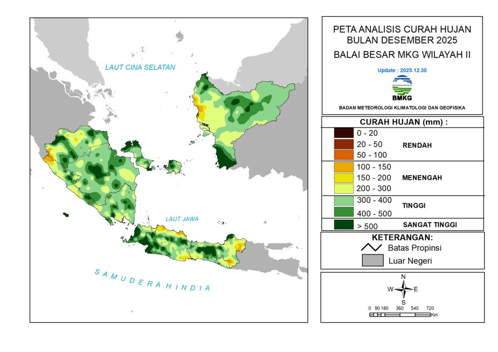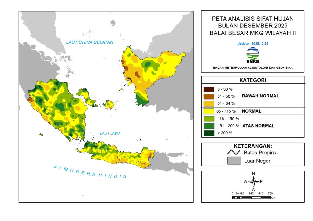 Curah hujan bulan Desember 2025 memiliki kategori Menengah hingga Sangat Tinggi (100 s.d. >500 mm/bulan). Sifat hujan bulan Desember 2025 memiliki sifat hujan Bawah Normal hingga Atas Normal. Sifat hujan dengan kategori Atas Normal (>200 %) terjadi di wilayah Jambi, Lampung, Bangka Belitung, dan Banten.