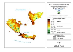 Curah hujan Dasarian II Maret 2026 diprakirakan berada pada kategori Rendah hingga Tinggi (10 – 300 mm/dasarian). Kategori Rendah (10 – 50 mm/dasarian) diprakirakan terjadi