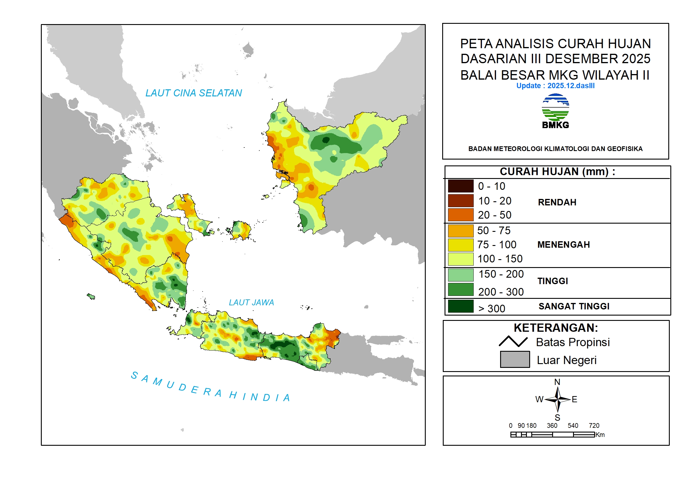 Curah hujan Dasarian III Desember 2025 berada pada kategori Rendah hingga Sangat Tinggi (0 s.d. > 300 mm/dasarian). Kategori Sangat Tinggi (> 300 mm/dasarian) terjadi di sebagian kecil wilayah: Bengkulu, Lampung, Banten, Jawa Barat, Jawa Tengah, dan Kalimantan Barat.