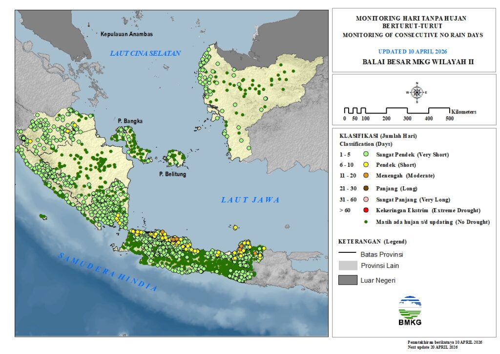 Monitoring Hari Tanpa Hujan berturut-turut pada Dasarian I April 2026 di lingkungan BBMKG Wilayah II, terpantau dengan klasifikasi Masih Ada Hujan hingga Menengah (11 – 20 hari). Hari Tanpa Hujan terpanjang dengan klasifikasi Menengah (11 – 20 hari) terpantau terjadi di Kec. Anjatan (Kab. Indramayu, Jawa Barat) dan Kec. Japah (Kab. Blora, Jawa Tengah) sebanyak 14 hari