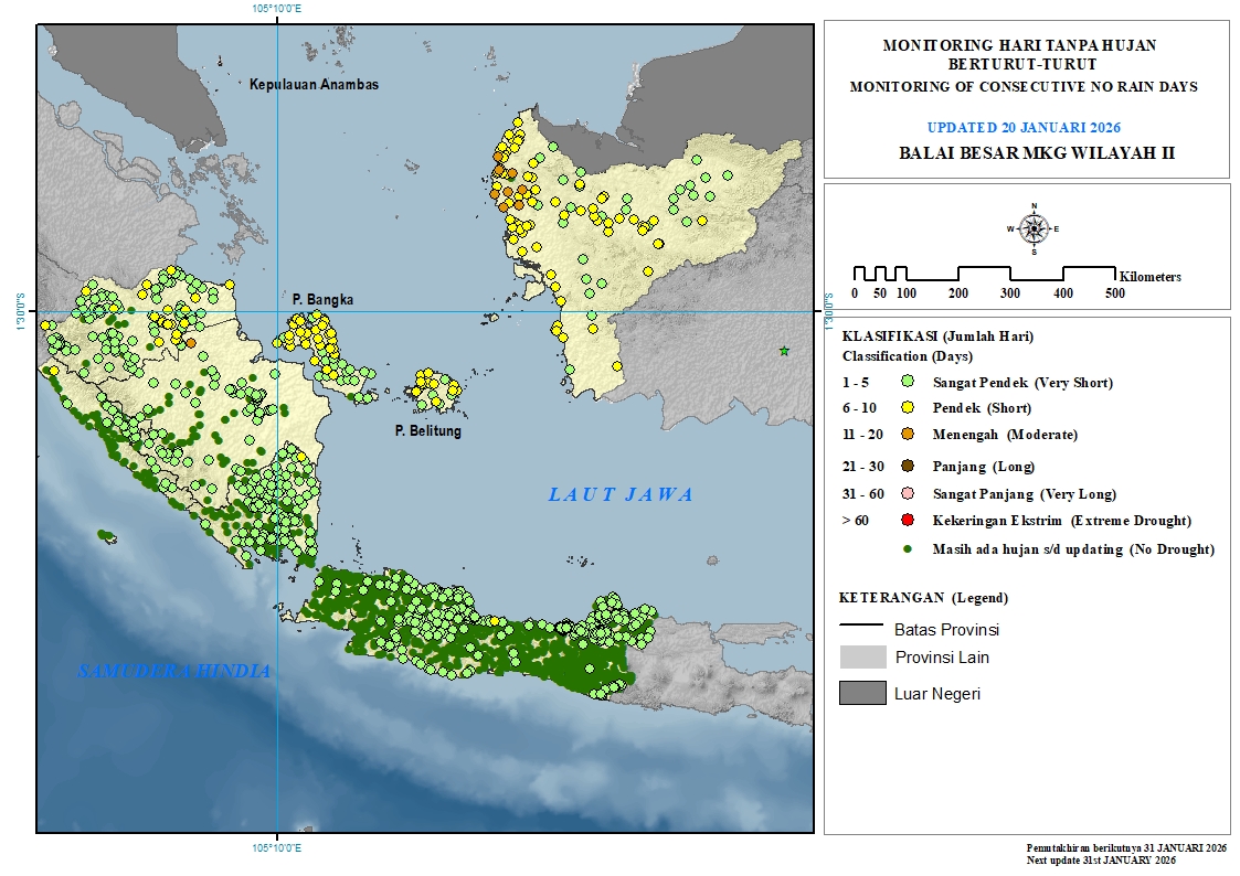 Hari Tanpa Hujan berturut-turut pada Dasarian II Januari 2026 di lingkungan BBMKG Wilayah II, sebagian besar terpantau dengan klasifikasi Masih Ada Hujan hingga Pendek (6 – 10 hari).