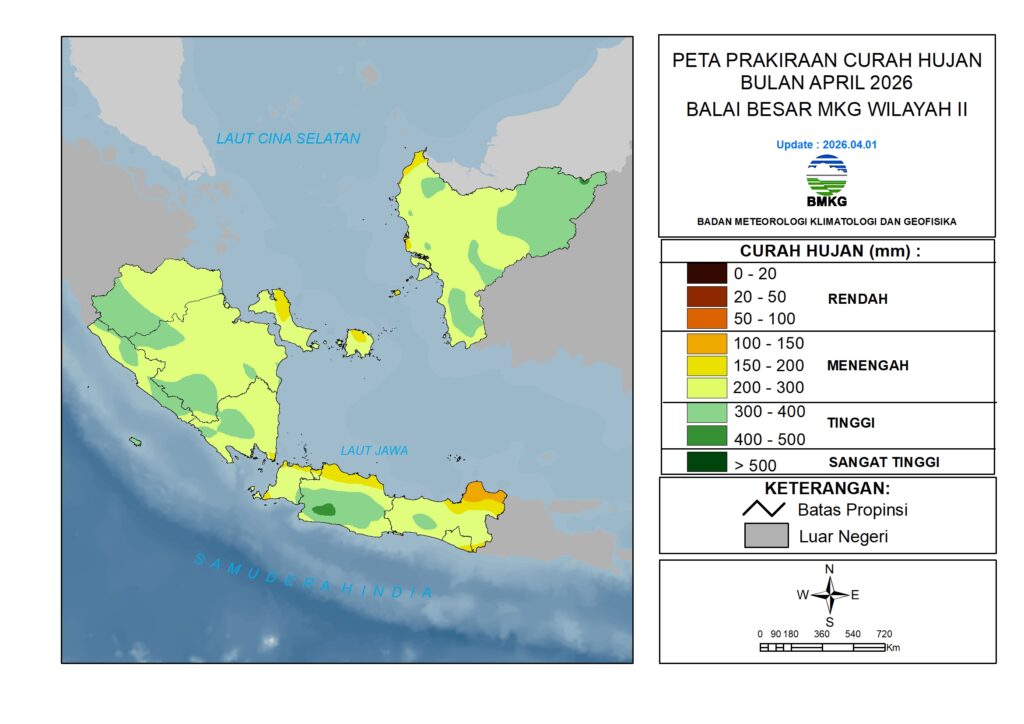 Curah hujan April 2026 diprakirakan berada pada kategori Menengah hingga Tinggi (100 s.d 500 mm/bulan). Wilayah dengan Kategori Tinggi (300 s.d 500 mm/bulan) diprakirakan terjadi di sebagian wilayah Jambi, Bengkulu, Sumatera Selatan, Lampung, Banten, Jawa Barat, Jawa Tengah, dan Kalimantan Barat.