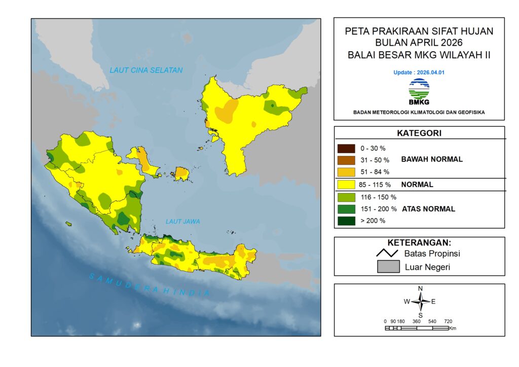 Sifat hujan April 2026 umumnya diprakirakan berada pada kategori Bawah Normal hingga Atas Normal. Wilayah dengan Kategori Atas Normal (>115%) diprakirakan terjadi di sebagian wilayah Jambi, Bengkulu, Sumatera Selatan, Lampung, Kep. Bangka Belitung, Banten, DK Jakarta, Jawa Barat, Jawa Tengah, DI Yogyakarta, dan Kalimantan Barat.