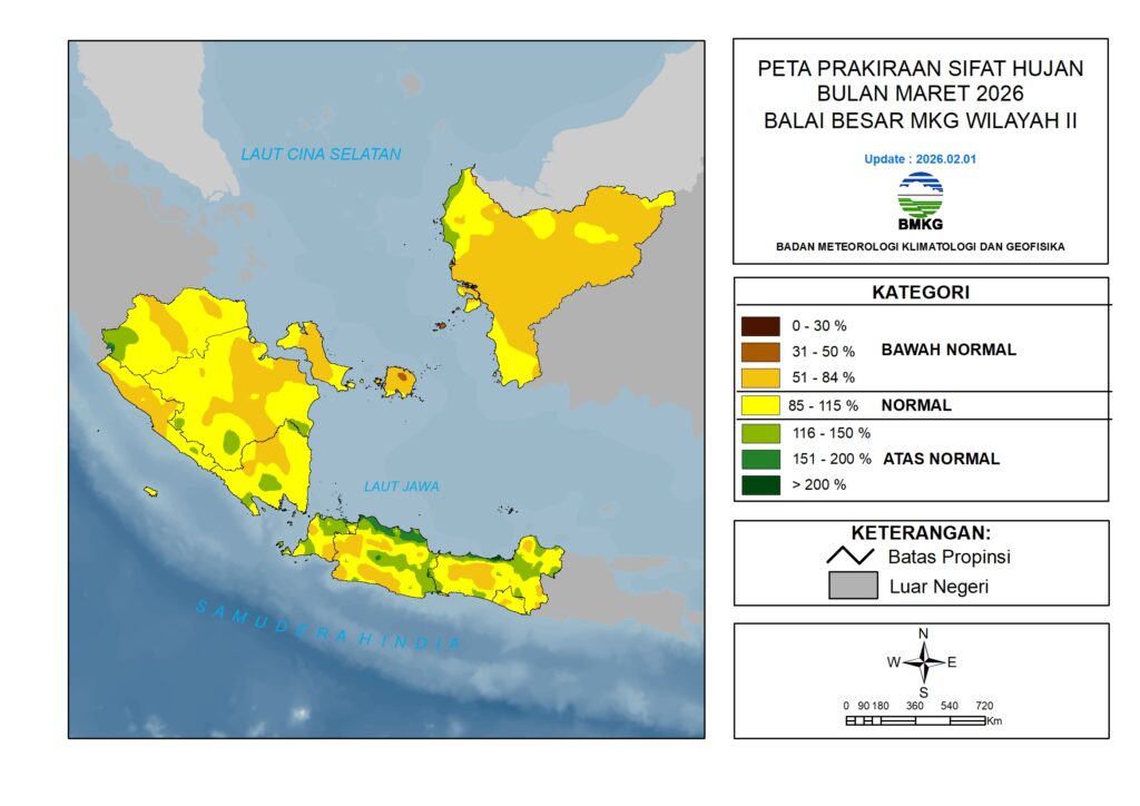 Curah hujan Maret 2026 diprediksi berada pada kategori Menengah hingga Tinggi (100 – 500 mm/bulan). Wilayah dengan Kategori Tinggi (300 – 500 mm/bulan) diprediksi terjadi di sebagian kecil wilayah Sumatera Selatan, Lampung, Banten, Jawa Barat, Jawa Tengah, DI Yogyakarta, dan Kalimantan Barat.