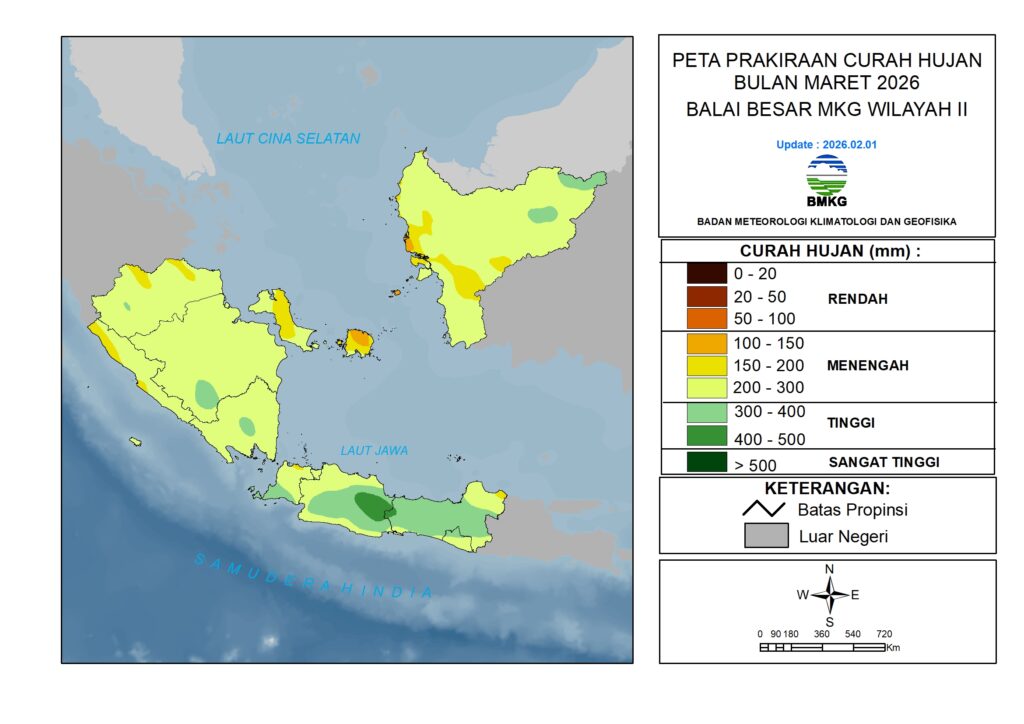 Curah hujan Maret 2026 diprediksi berada pada kategori Menengah hingga Tinggi (100 – 500 mm/bulan). Wilayah dengan Kategori Tinggi (300 – 500 mm/bulan) diprediksi terjadi di sebagian kecil wilayah Sumatera Selatan, Lampung, Banten, Jawa Barat, Jawa Tengah, DI Yogyakarta, dan Kalimantan Barat.