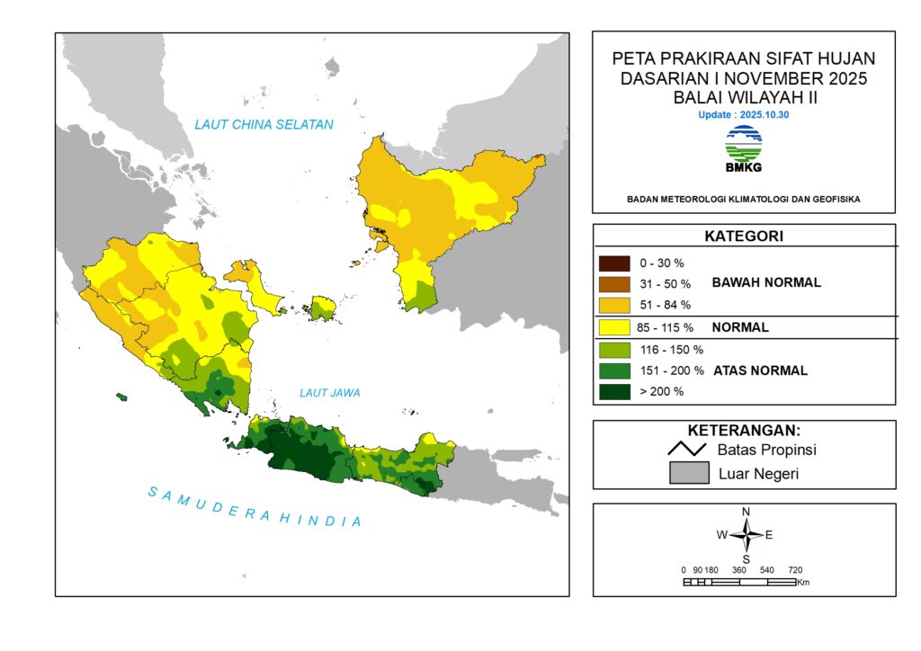 Sifat hujan Dasarian I November 2025 diprakirakan berada pada kategori Bawah Normal – Atas Normal.