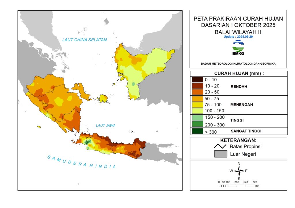 Curah hujan diprakirakan berada pada kategori Rendah – Tinggi (0 s.d. 300 mm/dasarian). Kategori Rendah (0 – 20 mm/dasarian) diprakirakan terjadi di wilayah Banten, DKI Jakarta, Jawa Barat, Jawa Tengah, dan DI Yogyakarta. Kategori Tinggi (150 s.d. 300 mm/dasarian) diprakirakan terjadi di sebagian kecil wilayah: Banten, Jawa Barat, dan Kalimantan Barat.
