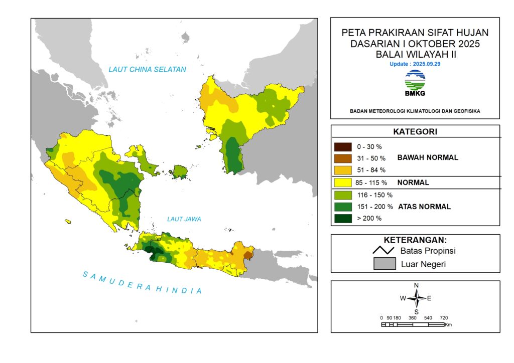 Sifat hujan diprakirakan berada pada kategori Bawah Normal – Atas Normal. Kategori Bawah Normal (31 – 50%) diprakirakan terjadi di sebagian kecil wilayah: Jawa Tengah. Kategori Atas Normal (>200%) diprakirakan terjadi di wilayah: Banten dan Jawa Barat.