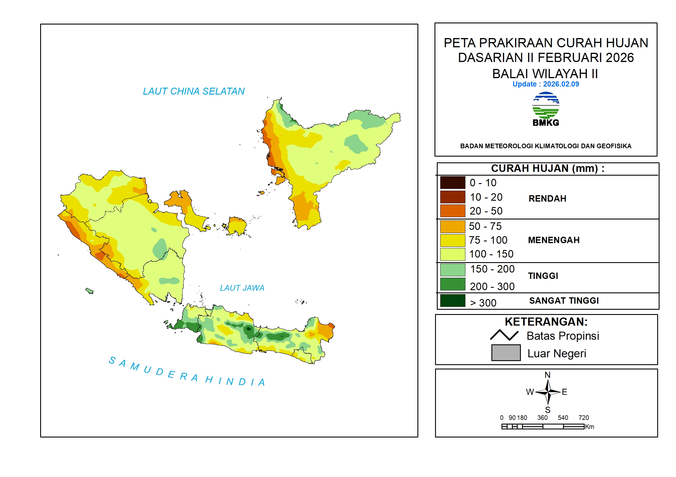 Curah hujan Dasarian II Februari 2026 diprakirakan berada pada kategori Rendah hingga Sangat Tinggi (20 s.d >300 mm/dasarian). Kategori Rendah (20 – 50 mm/dasarian) diprakirakan terjadi di wilayah: Bengkulu, Jawa Tengah, dan Kalimantan Barat. Kategori Sangat Tinggi (>300 mm/dasarian) diprakirakan terjadi di wilayah: Jawa Barat