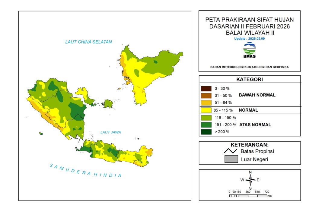 Sifat hujan Dasarian II Februari 2026 diprakirakan berada pada kategori Bawah Normal – Atas Normal. Kategori Atas Normal diprakirakan terjadi di wilayah: Jambi, Sumatera Selatan, Kepulauan Bangka Belitung, Lampung, Banten, Jawa Barat, Jawa Tengah, dan Kalimantan Barat