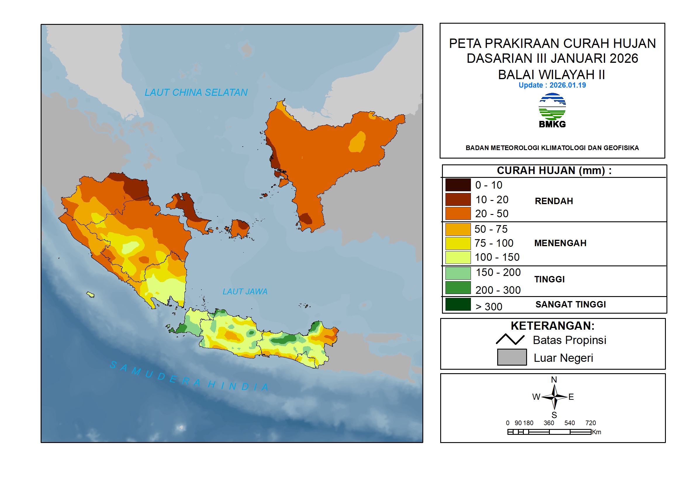 Curah hujan Dasarian III Januari 2026 diprakirakan berada pada kategori Rendah hingga Sangat Tinggi (10 s.d. >300 mm/dasarian). Kategori Rendah (10 – 20 mm/dasarian) diprakirakan terjadi di wilayah: Jambi, Sumatera Selatan, Kep. Bangka Belitung, dan Kalimantan Barat. Kategori Sangat Tinggi (>300 mm/dasarian) diprakirakan terjadi di wilayah: Kab. Jepara Jawa Tengah