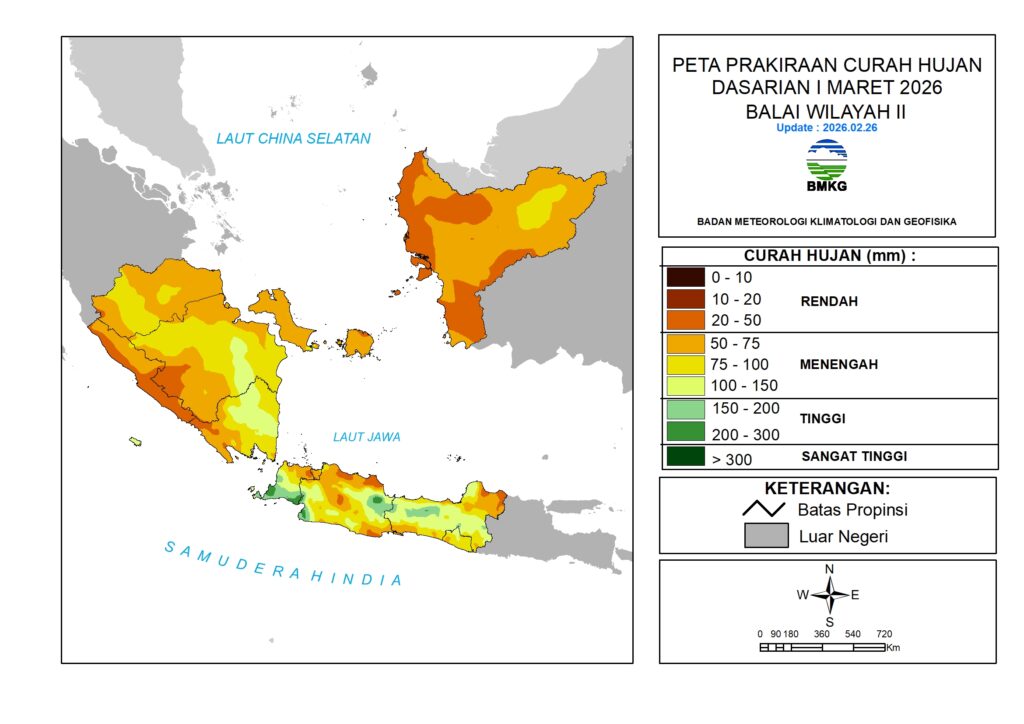 Curah hujan Dasarian I Maret 2026 diprakirakan berada pada kategori Rendah hingga Tinggi (20 – 300 mm/dasarian). Kategori Rendah (20 – 50 mm/dasarian) diprakirakan terjadi di sebagian wilayah: Jambi, Bengkulu, Sumatera Selatan, Lampung, Kep. Bangka Belitung, Banten, Jawa Barat, Jawa Tengah, dan Kalimantan Barat, sedangkan Kategori Tinggi (150 – 300 mm/dasarian) diprakirakan terjadi di sebagian wilayah: Banten, Jawa Barat, dan Jawa Tengah.Â