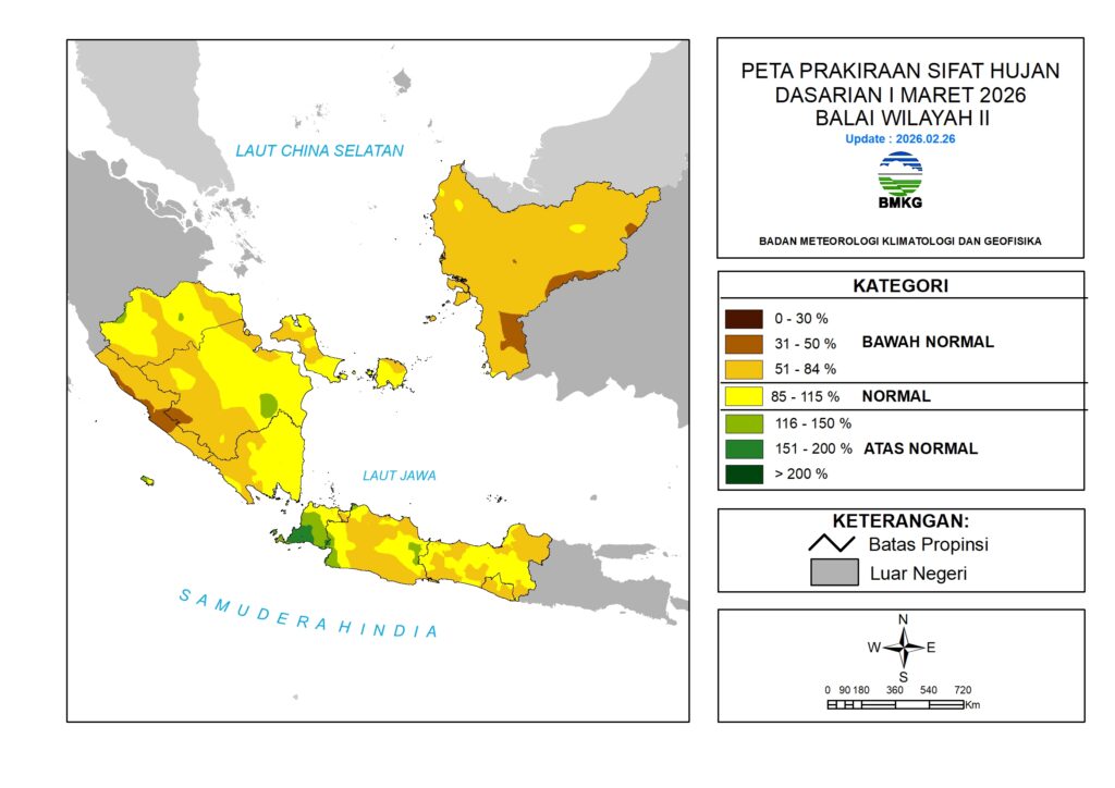 Sifat hujan Dasarian I Maret 2026 diprakirakan berada pada kategori Bawah Normal – Atas Normal. Kategori Atas Normal diprakirakan terjadi di sebagian wilayah: Jambi, Sumatera Selatan, Kep. Bangka Belitung, Banten, dan Jawa Barat.