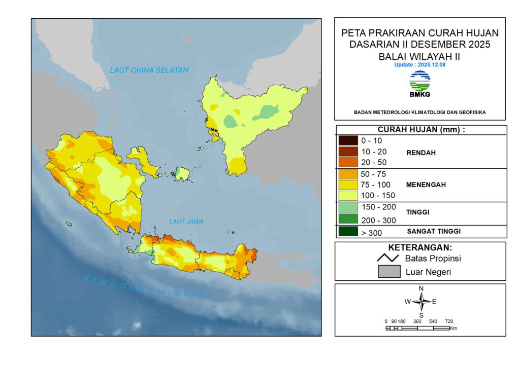 Curah hujan Dasarian II Desember 2025 diprakirakan berada pada kategori Rendah hingga Tinggi (20 – 200 mm/dasarian). Kategori Rendah (20 – 50 mm/dasarian) diprakirakan terjadi di wilayah: sebagian kecil Bengkulu, Banten bagian Utara, Jawa Barat bagian Utara, dan Jawa Tengah bagian Utara. Kategori Tinggi (150 – 200 mm/dasarian) diprakirakan terjadi di wilayah: sebagian kecil Kep. Bangka Belitung, Banten, Jawa Barat, dan Kalimantan Barat.