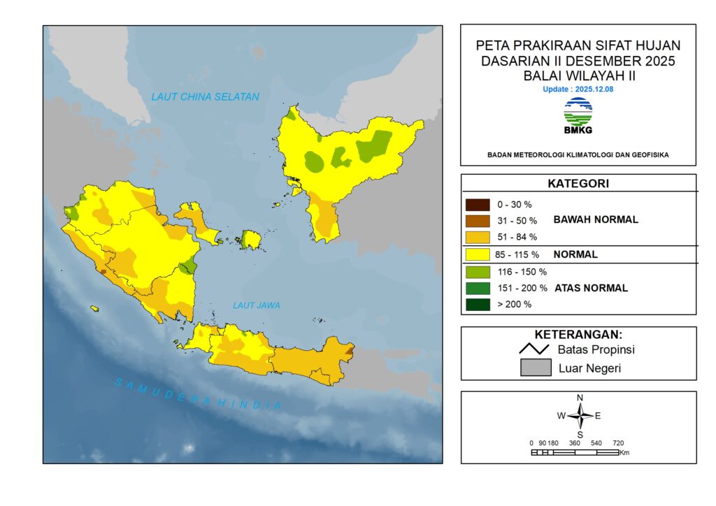 Sifat hujan Dasarian II Desember 2025 diprakirakan berada pada kategori Bawah Normal – Atas Normal. Kategori Atas Normal (>115%) diprakirakan terjadi di wilayah: sebagian kecil Jambi, Sumatera Selatan, Lampung, Kep. Bangka Belitung, Banten, Jawa Barat, dan Kalimantan Barat