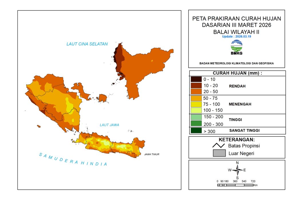 Curah hujan Dasarian III Maret 2026 diprakirakan berada pada kategori Rendah hingga Menengah (10 – 150 mm/dasarian). Kategori Rendah (0 – 20 mm/dasarian) diprakirakan terjadi di sebagian wilayah: Bengkulu, Sumatera Selatan, Banten, dan Kalimantan Barat. Kategori Menengah (100 – 150 mm/dasarian) diprakirakan terjadi di sebagian wilayah: Jawa Barat dan Jawa Tengah.