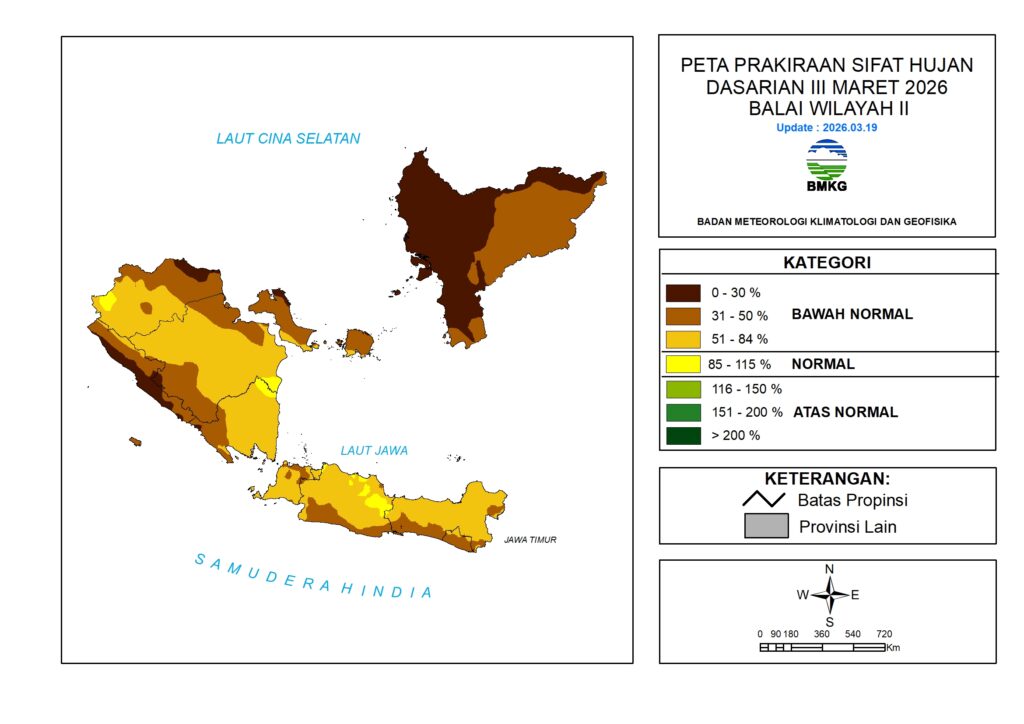 Sifat hujan Dasarian III Maret 2026 diprakirakan berada pada kategori Bawah Normal – Normal. Kategori Normal diprakirakan terjadi di sebagian wilayah: Jambi, Sumatera Selatan, Lampung, Jawa Barat, dan Jawa Tengah.