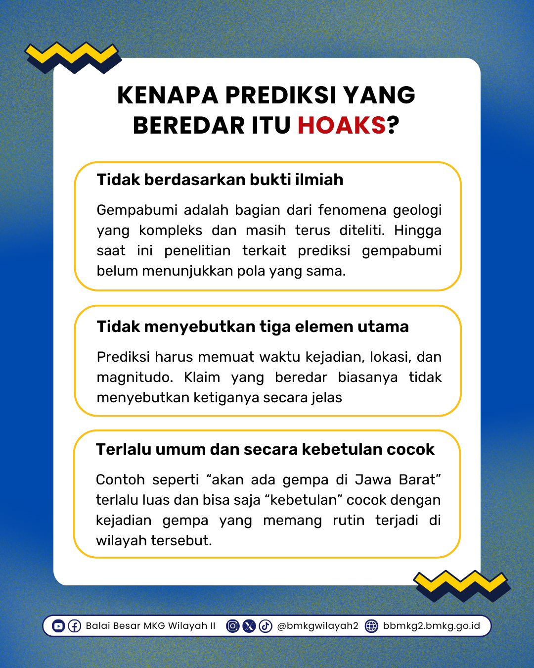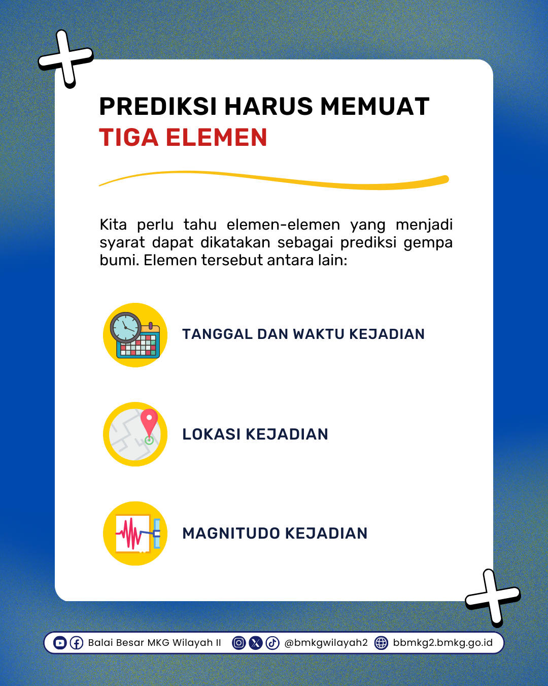 Pertama, kita perlu tahu bahwa sebuah prediksi gempa harus memuat tiga elemen utama: waktu kejadian, lokasi kejadian, dan magnitudo. Tanpa ketiganya, informasi tersebut tidak bisa disebut sebagai prediksi ilmiah.