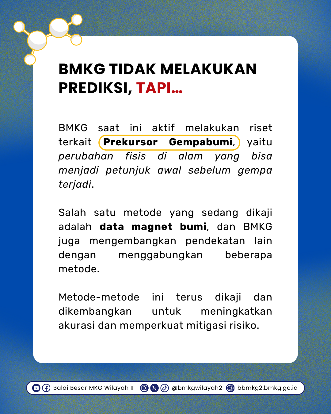 BMKG sendiri tidak melakukan prediksi gempa. Namun, BMKG aktif melakukan riset tentang prekursor gempabumi—yaitu perubahan fisik di alam yang bisa menjadi petunjuk awal sebelum gempa terjadi. Salah satu metode yang sedang dikaji adalah pengamatan magnet bumi, dan BMKG terus mengembangkan pendekatan lain untuk memperkuat mitigasi risiko.