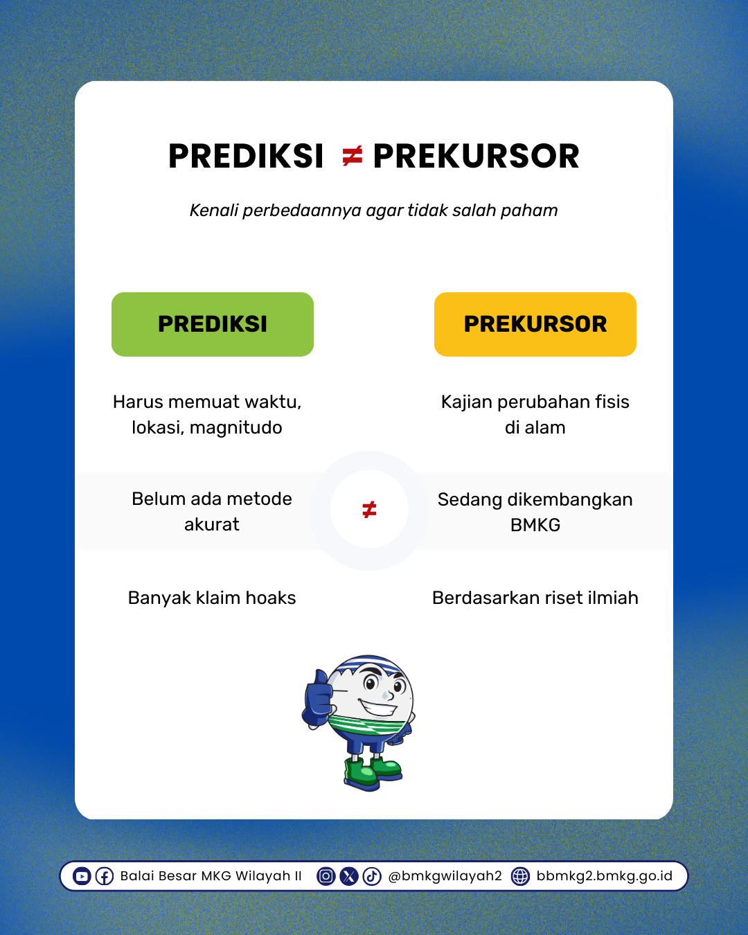 Infografis ini juga menjelaskan perbedaan antara prediksi dan prekursor. Prediksi menuntut kepastian waktu, lokasi, dan magnitudo, sementara prekursor adalah kajian ilmiah terhadap gejala alam yang bisa menjadi sinyal awal.