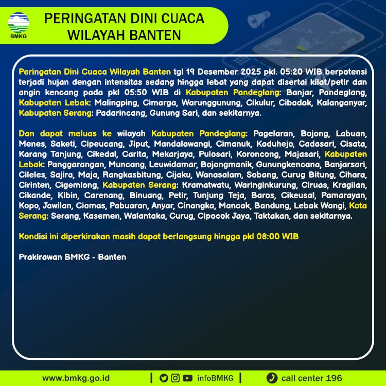 Peringatan Dini Cuaca Banten tgl 19 Desember 2025 pkl 05:20 WIB berpotensi terjadi Hujan Sedang-Lebat yang dapat disertai Kilat/Petir dan Angin Kencang pada pkl. 05:50 WIB di