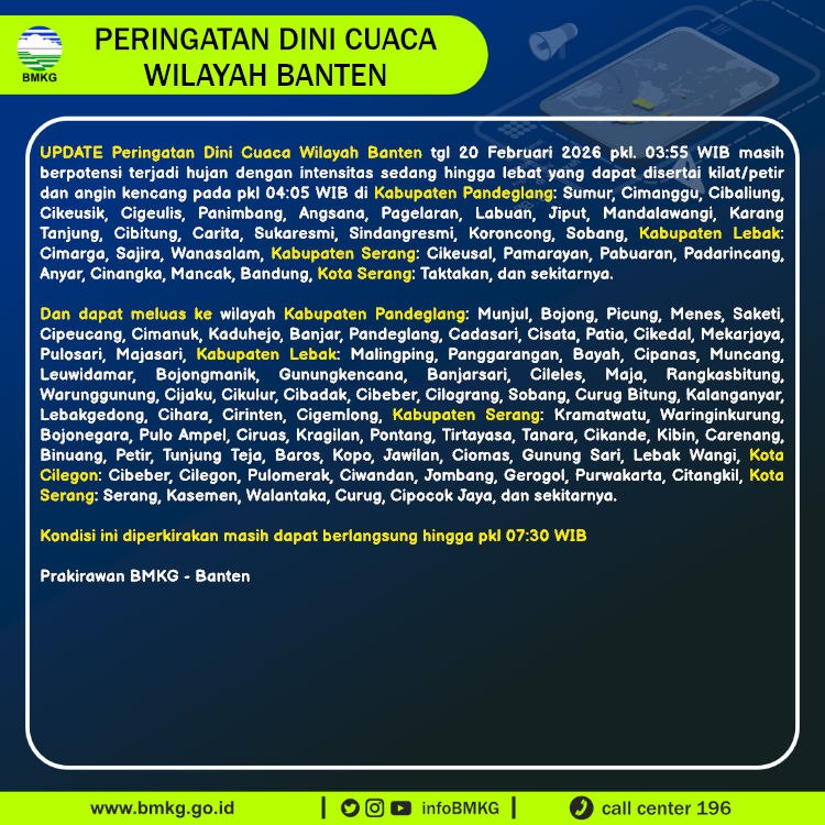 UPDATE Peringatan Dini Cuaca Banten tgl 20 Februari 2026 pkl 03:55 WIB masih berpotensi terjadi Hujan Sedang-Lebat yang dapat disertai Kilat/Petir dan Angin Kencang pada pkl. 04:05 WIB di