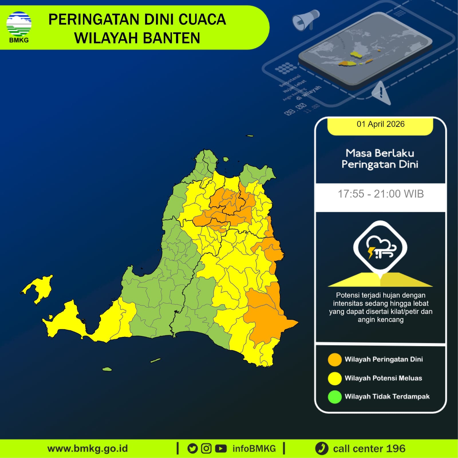 UPDATE Peringatan Dini Cuaca Banten tgl 2 April 2026 pkl 14:40 WIB masih berpotensi terjadi Hujan Sedang-Lebat yang dapat disertai Kilat/Petir dan Angin Kencang pada pkl. 14:50 WIB di