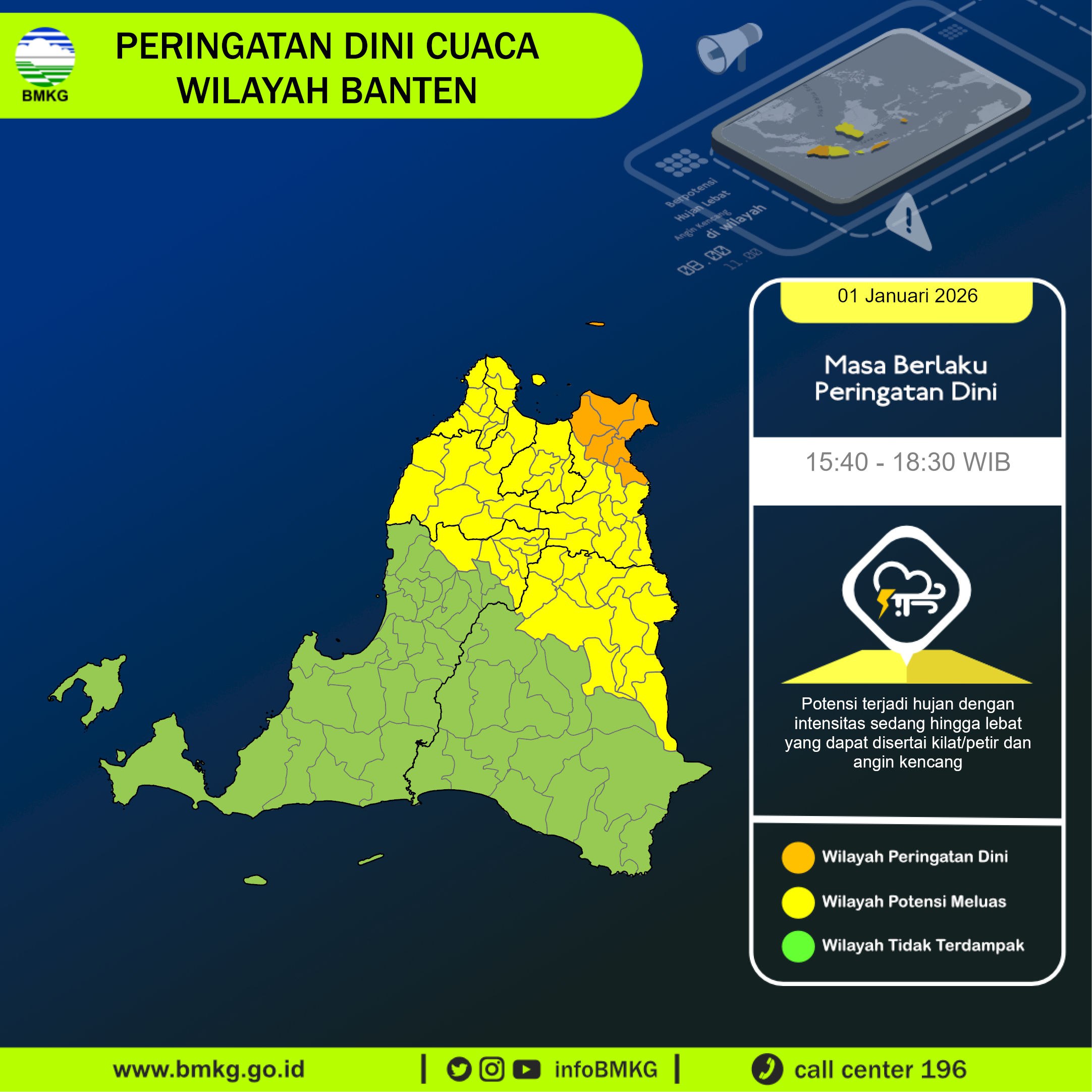 Peringatan Dini Cuaca Banten tgl 2 Januari 2026 pkl 10:35 WIB berpotensi terjadi Hujan Sedang-Lebat yang dapat disertai Kilat/Petir dan Angin Kencang pada pkl. 10:45 WIB di