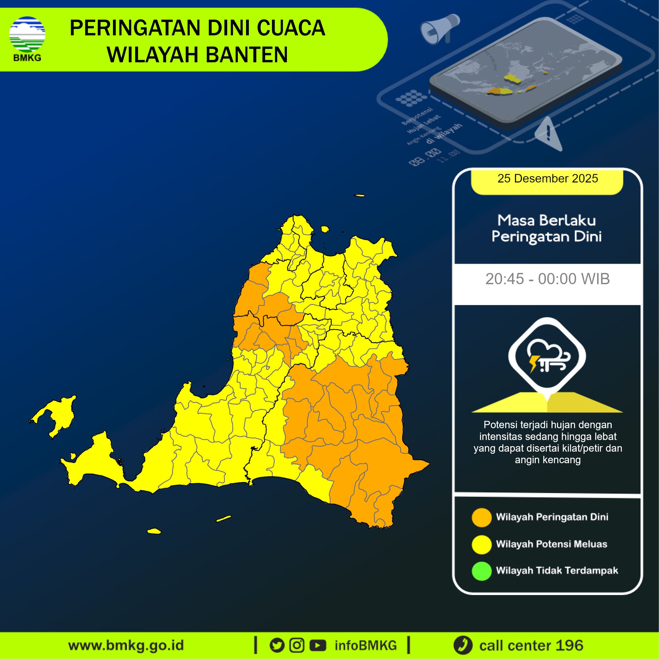 UPDATE Peringatan Dini Cuaca Banten tgl 26 Desember 2025 pkl 03:35 WIB masih berpotensi terjadi Hujan Sedang-Lebat yang dapat disertai Kilat/Petir dan Angin Kencang pada pkl. 04:05 WIB di