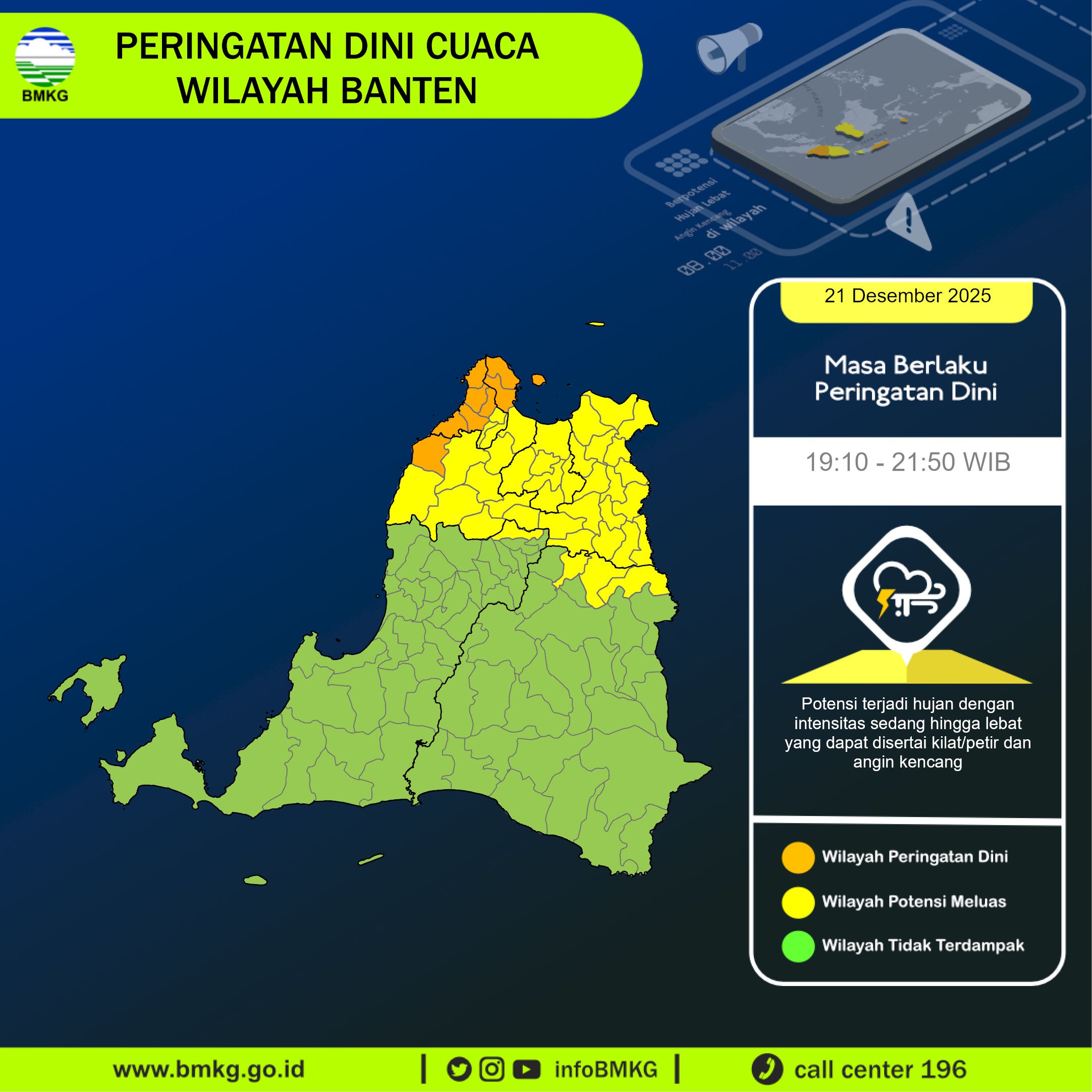 UPDATE Peringatan Dini Cuaca Banten tgl 21 Desember 2025 pkl 19:00 WIB masih berpotensi terjadi Hujan Sedang-Lebat yang dapat disertai Kilat/Petir dan Angin Kencang pada pkl. 19:10 WIB di