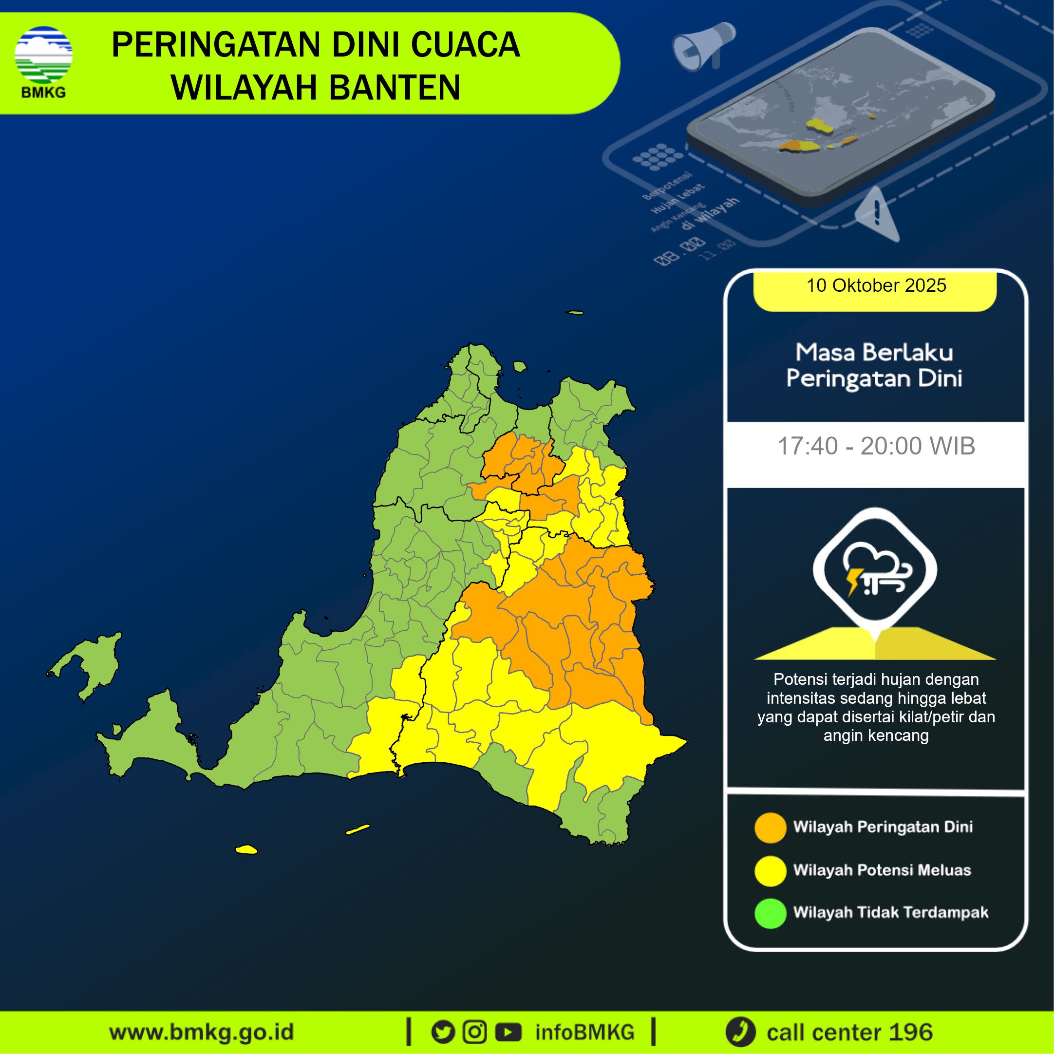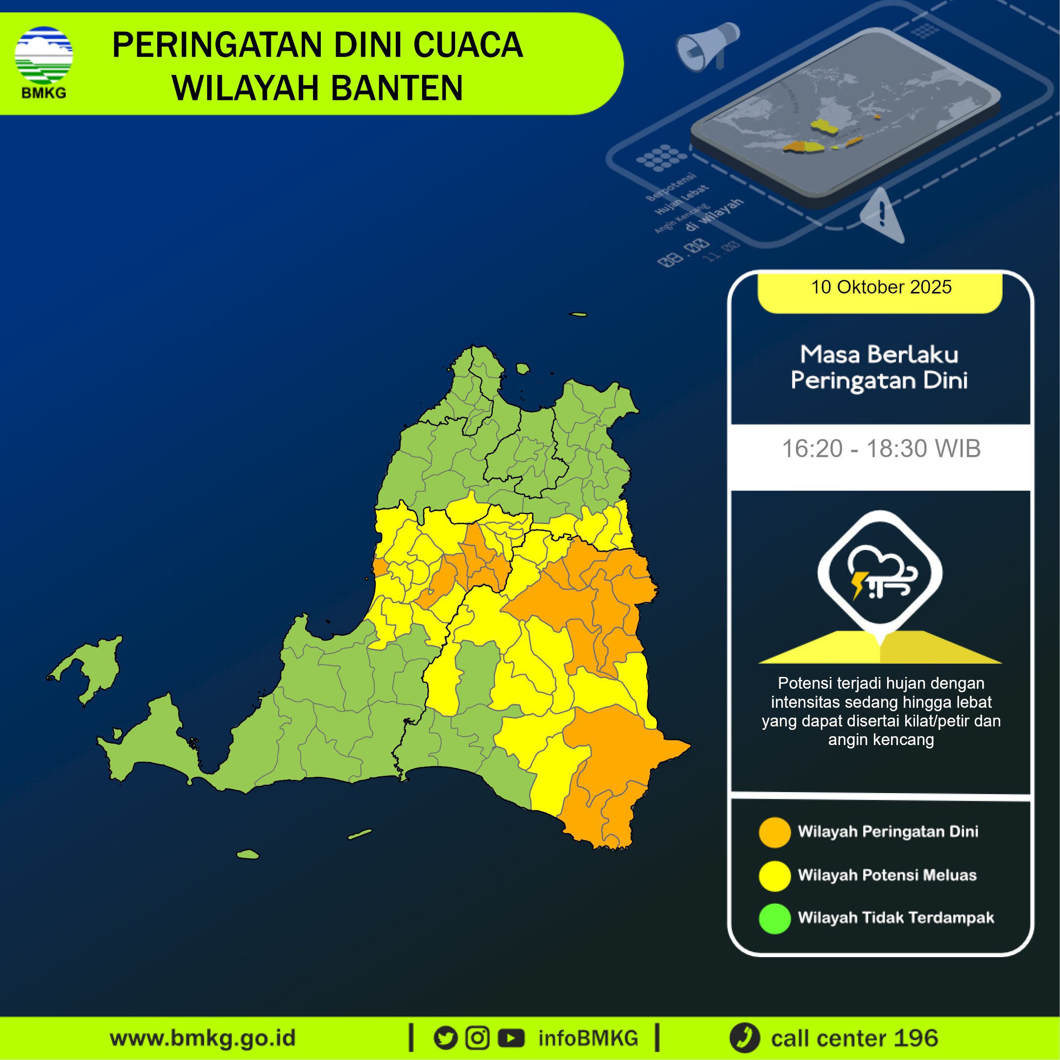 Peringatan Dini Cuaca Banten tgl 11 Oktober 2025 pkl 12:35 WIB berpotensi terjadi Hujan Sedang-Lebat yang dapat disertai Kilat/Petir dan Angin Kencang pada pkl. 12:45 WIB di