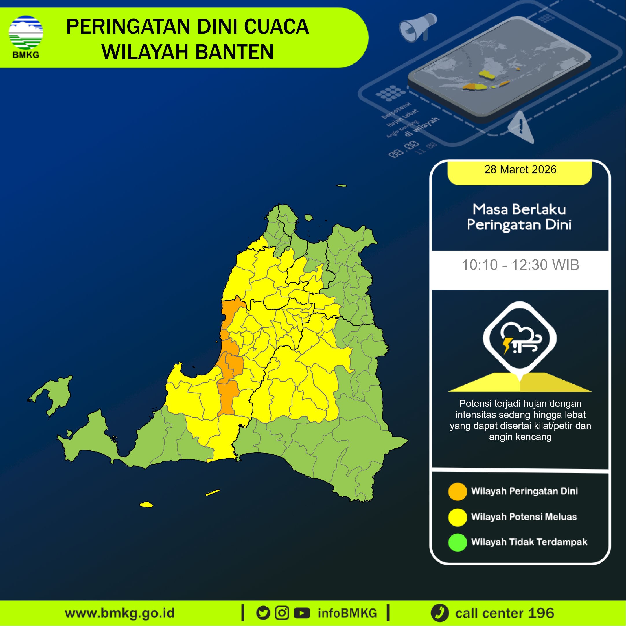 Peringatan Dini Cuaca Banten tgl 28 Maret 2026 pkl 13:15 WIB berpotensi terjadi Hujan Sedang-Lebat yang dapat disertai Kilat/Petir dan Angin Kencang pada pkl. 13:25 WIB di