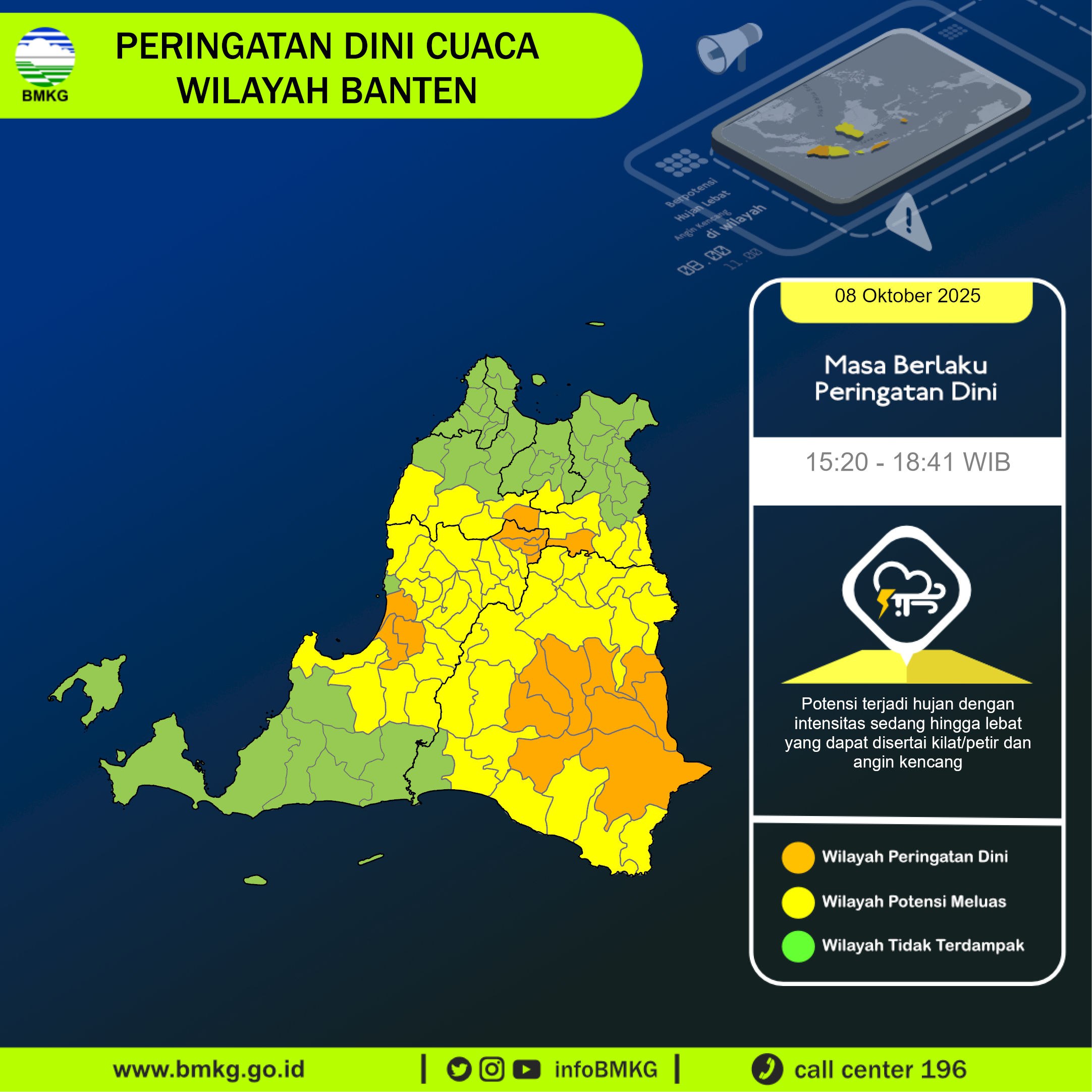 UPDATE Peringatan Dini Cuaca Banten tgl 8 Oktober 2025 pkl 15:10 WIB masih berpotensi terjadi Hujan Sedang-Lebat yang dapat disertai Kilat/Petir dan Angin Kencang pada pkl. 15:20 WIB di