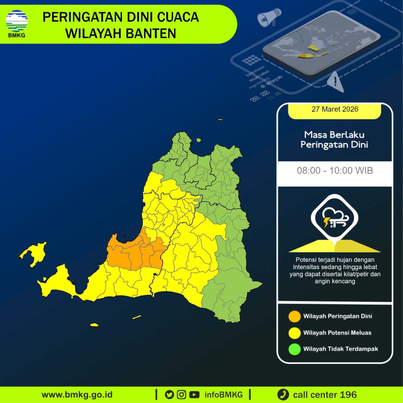 UPDATE Peringatan Dini Cuaca Banten tgl 27 Maret 2026 pkl 07:50 WIB masih berpotensi terjadi Hujan Sedang-Lebat yang dapat disertai Kilat/Petir dan Angin Kencang pada pkl. 08:00 WIB di
