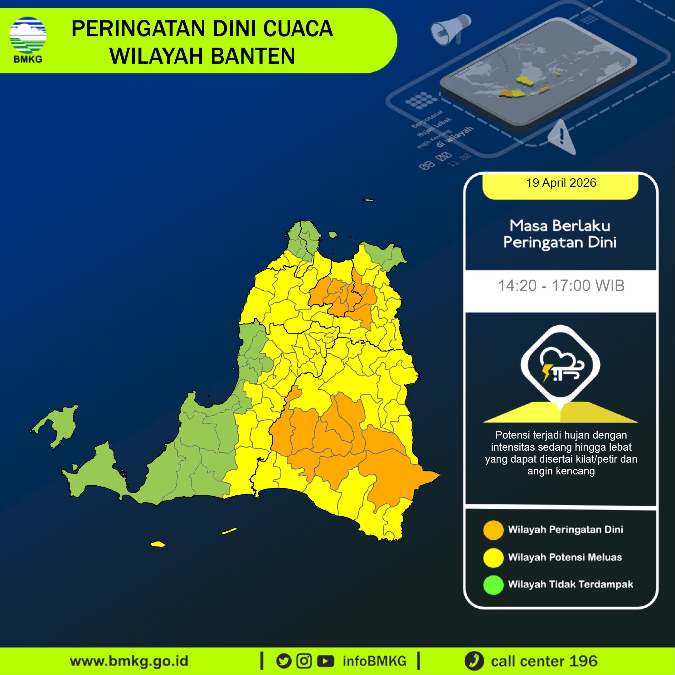 UPDATE Peringatan Dini Cuaca Banten tgl 19 April 2026 pkl 18:15 WIB masih berpotensi terjadi Hujan Sedang-Lebat yang dapat disertai Kilat/Petir dan Angin Kencang pada pkl. 18:25 WIB di