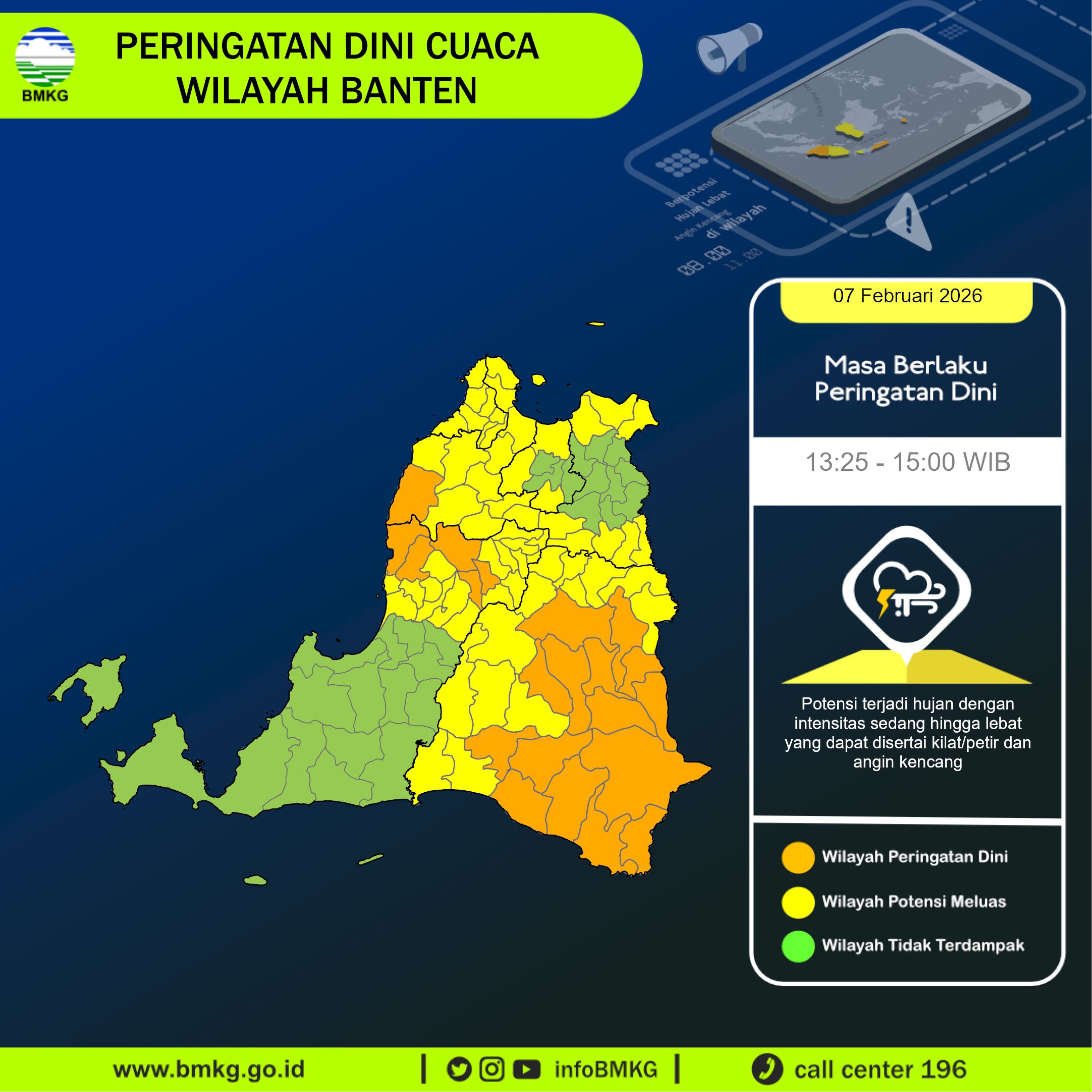 Peringatan Dini Cuaca Banten tgl 7 Februari 2026 pkl 21:50 WIB berpotensi terjadi Hujan Sedang-Lebat yang dapat disertai Kilat/Petir dan Angin Kencang pada pkl. 22:15 WIB di