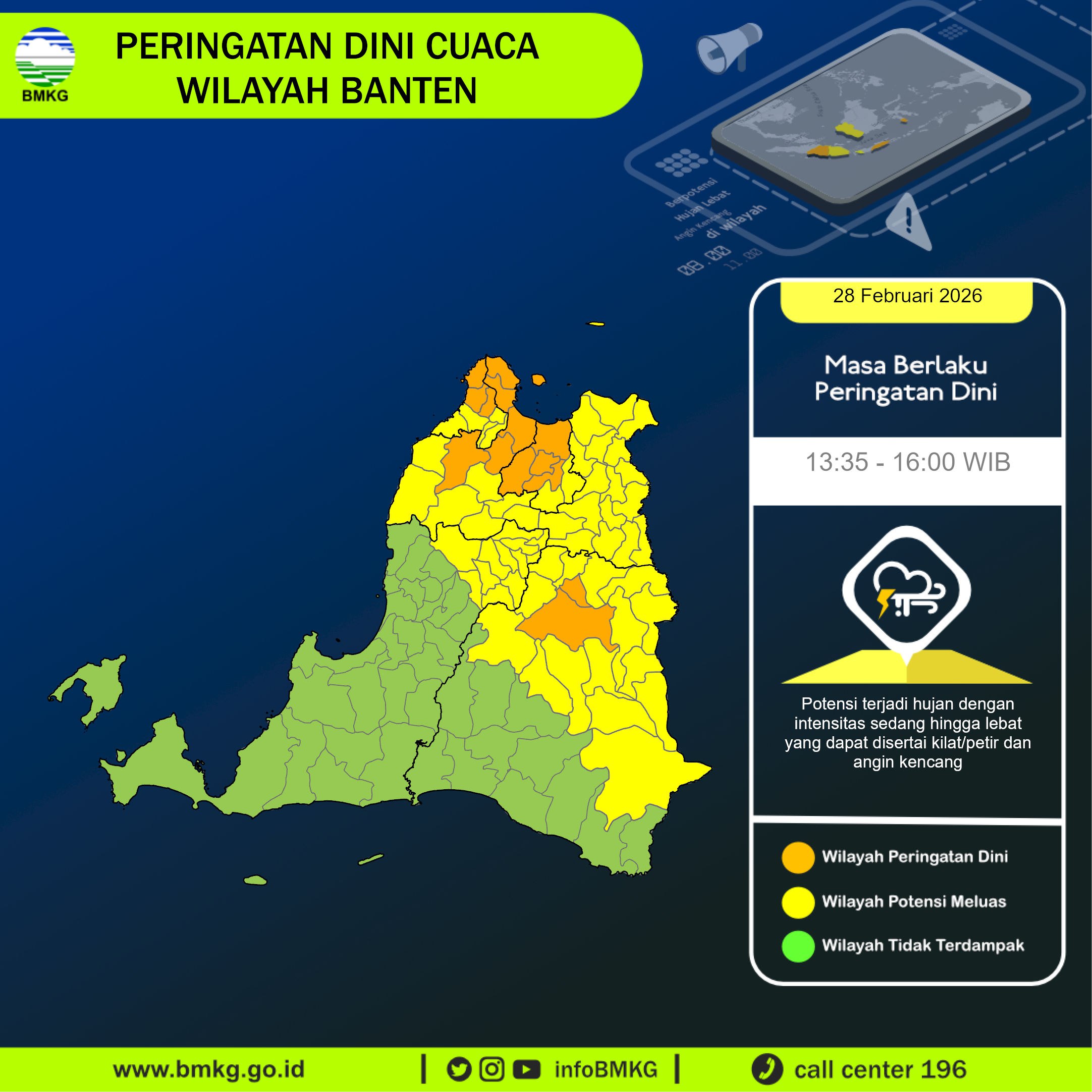 Peringatan Dini Cuaca Banten tgl 28 Februari 2026 pkl 13:25 WIB berpotensi terjadi Hujan Sedang-Lebat yang dapat disertai Kilat/Petir dan Angin Kencang pada pkl. 13:35 WIB di