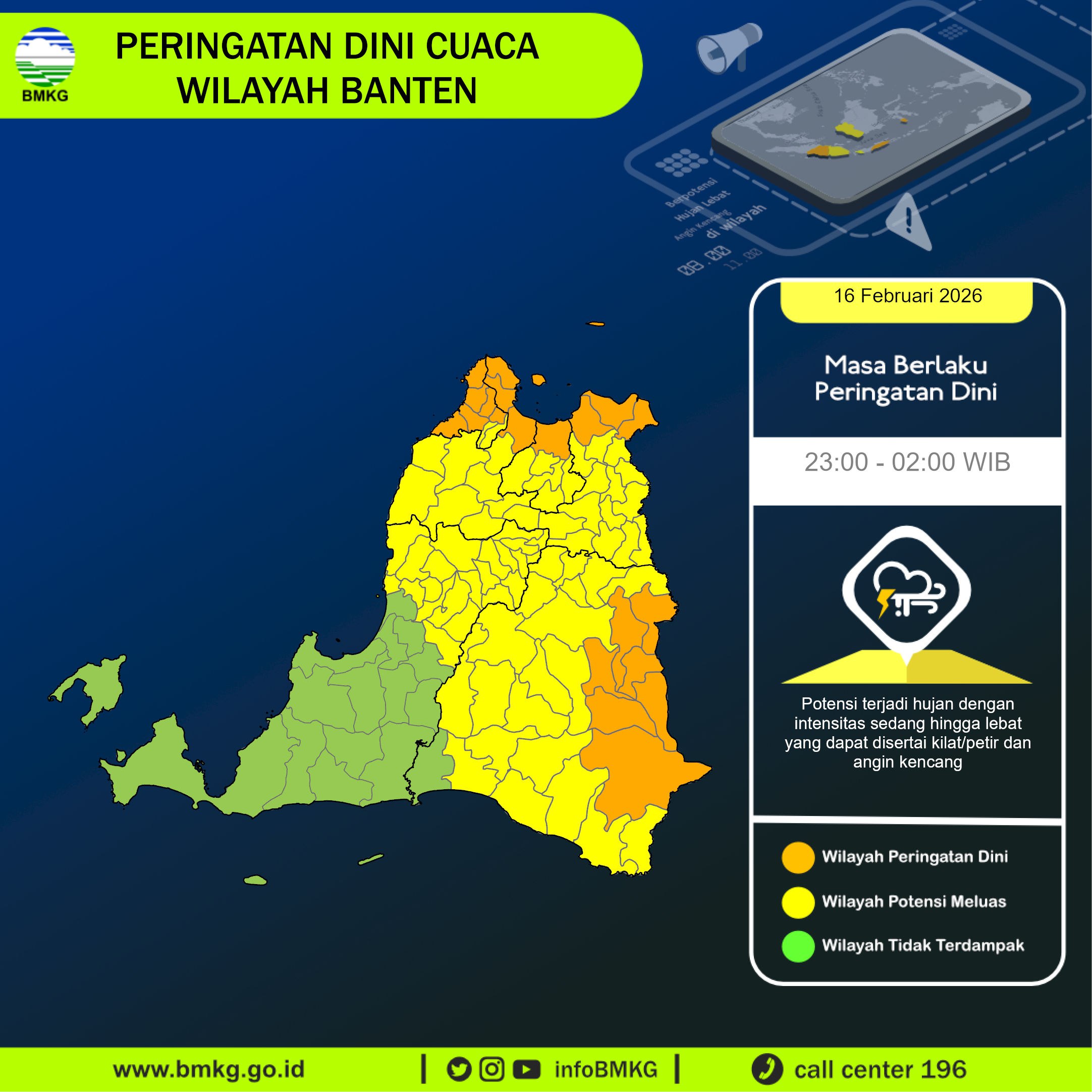 UPDATE Peringatan Dini Cuaca Banten tgl 16 Februari 2026 pkl 22:50 WIB masih berpotensi terjadi Hujan Sedang-Lebat yang dapat disertai Kilat/Petir dan Angin Kencang pada pkl. 23:00 WIB di
