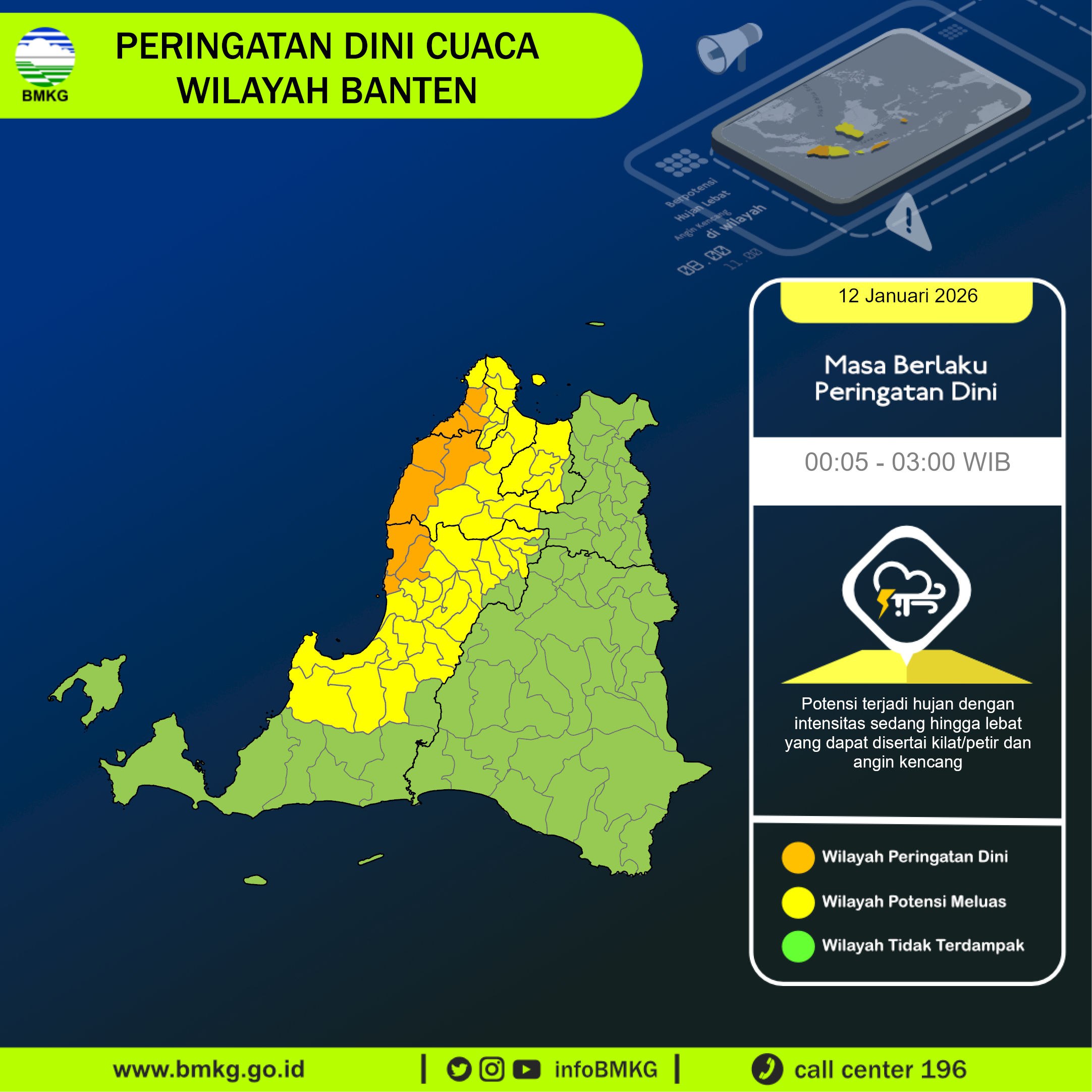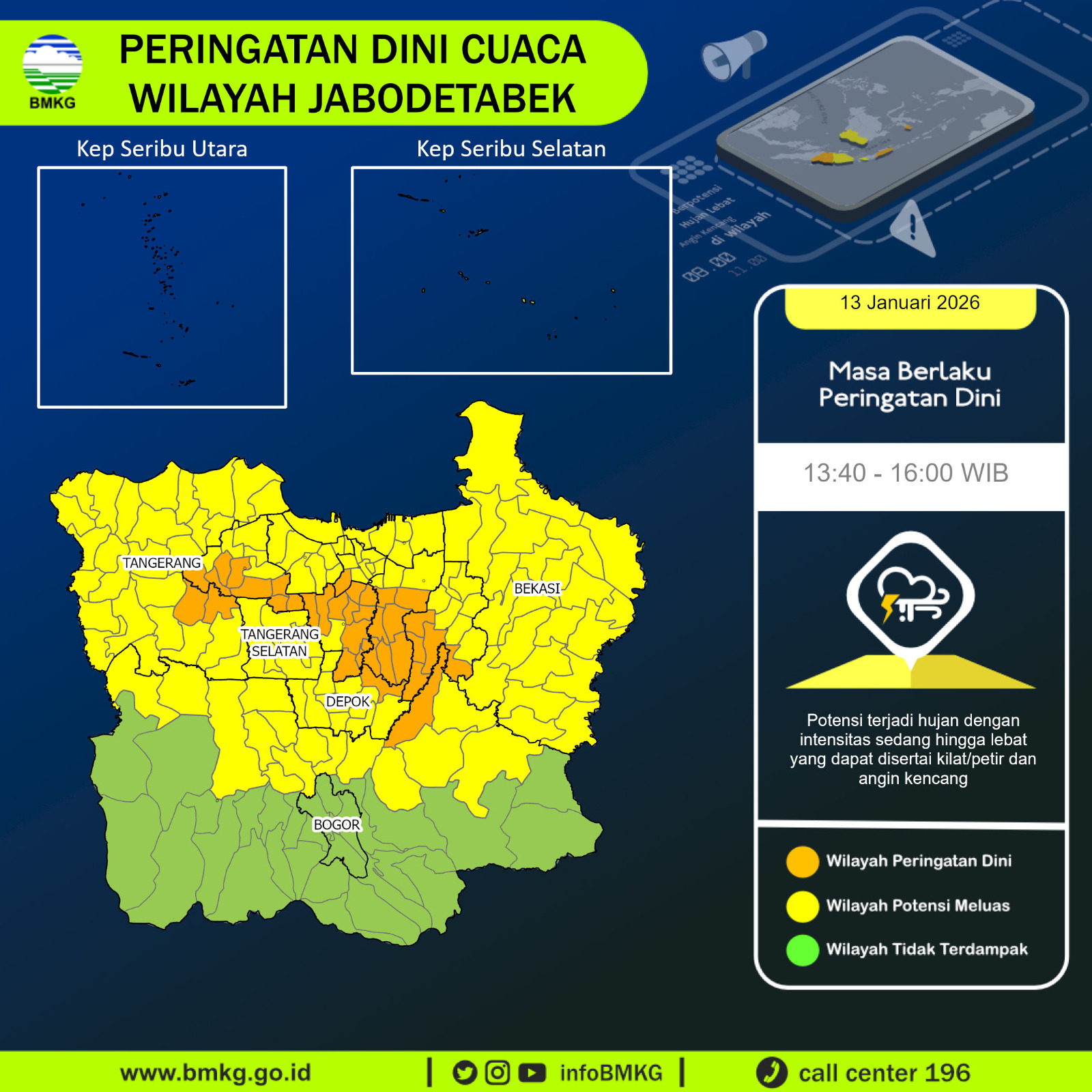 UPDATE Peringatan Dini Cuaca Jabodetabek tgl 13 Januari 2026 pkl 13:30 WIB masih berpotensi terjadi Hujan Sedang-Lebat yang dapat disertai Kilat/Petir dan Angin Kencang pada pkl. 13:40 WIB di