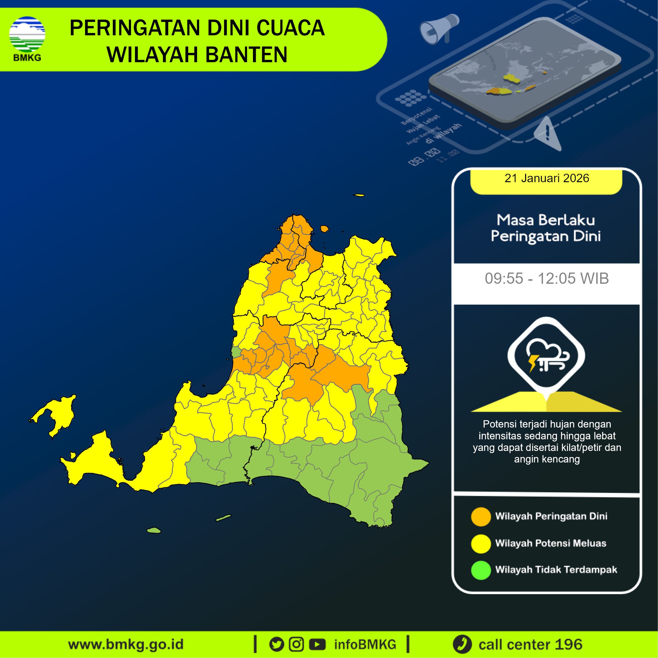 UPDATE Peringatan Dini Cuaca Banten tgl 21 Januari 2026 pkl 09:40 WIB masih berpotensi terjadi Hujan Sedang-Lebat yang dapat disertai Kilat/Petir dan Angin Kencang pada pkl. 09:55 WIB di