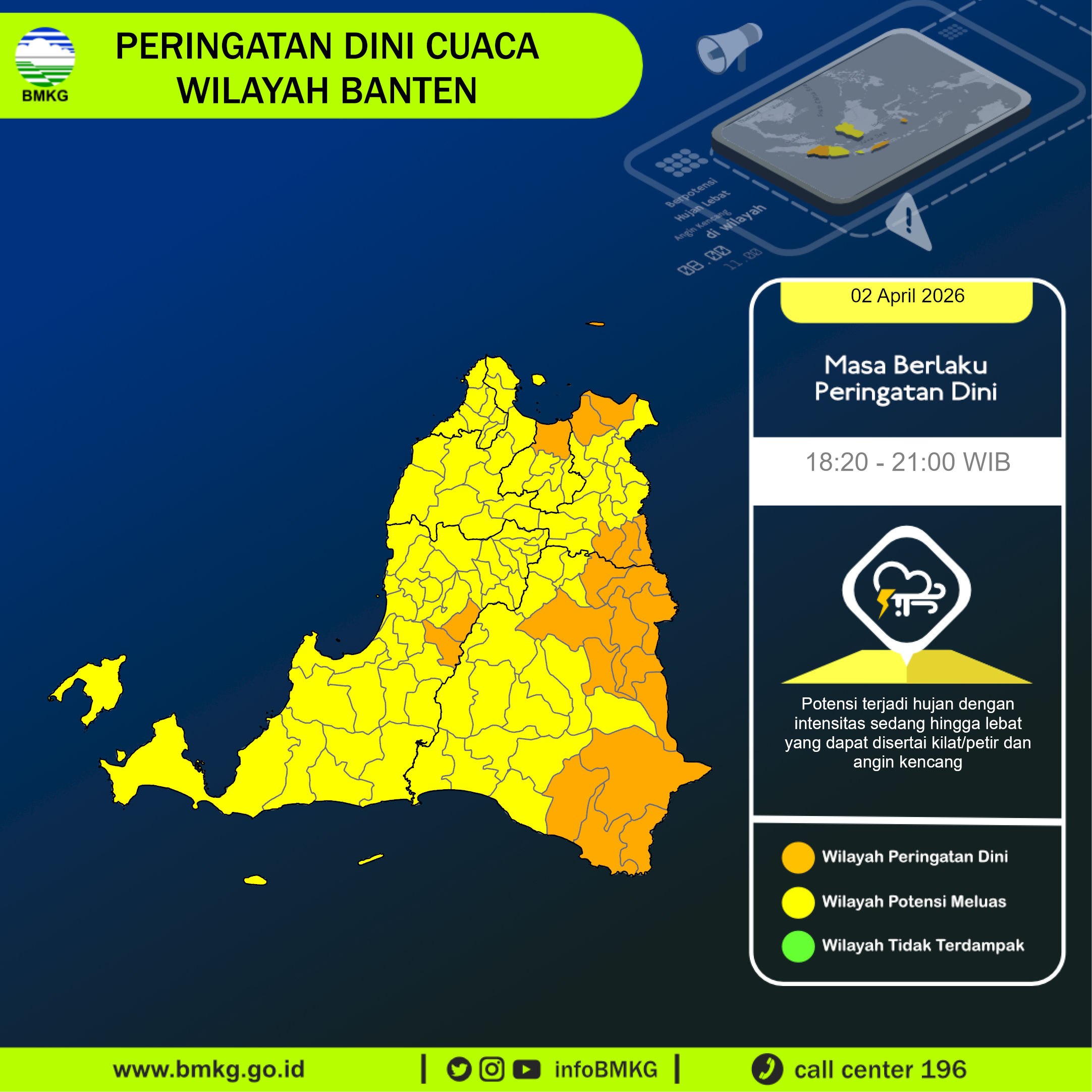 Peringatan Dini Cuaca Banten tgl 3 April 2026 pkl 16:13 WIB berpotensi terjadi Hujan Sedang-Lebat yang dapat disertai Kilat/Petir dan Angin Kencang pada pkl. 16:23 WIB di