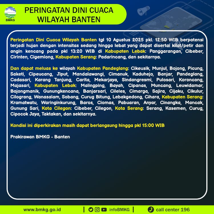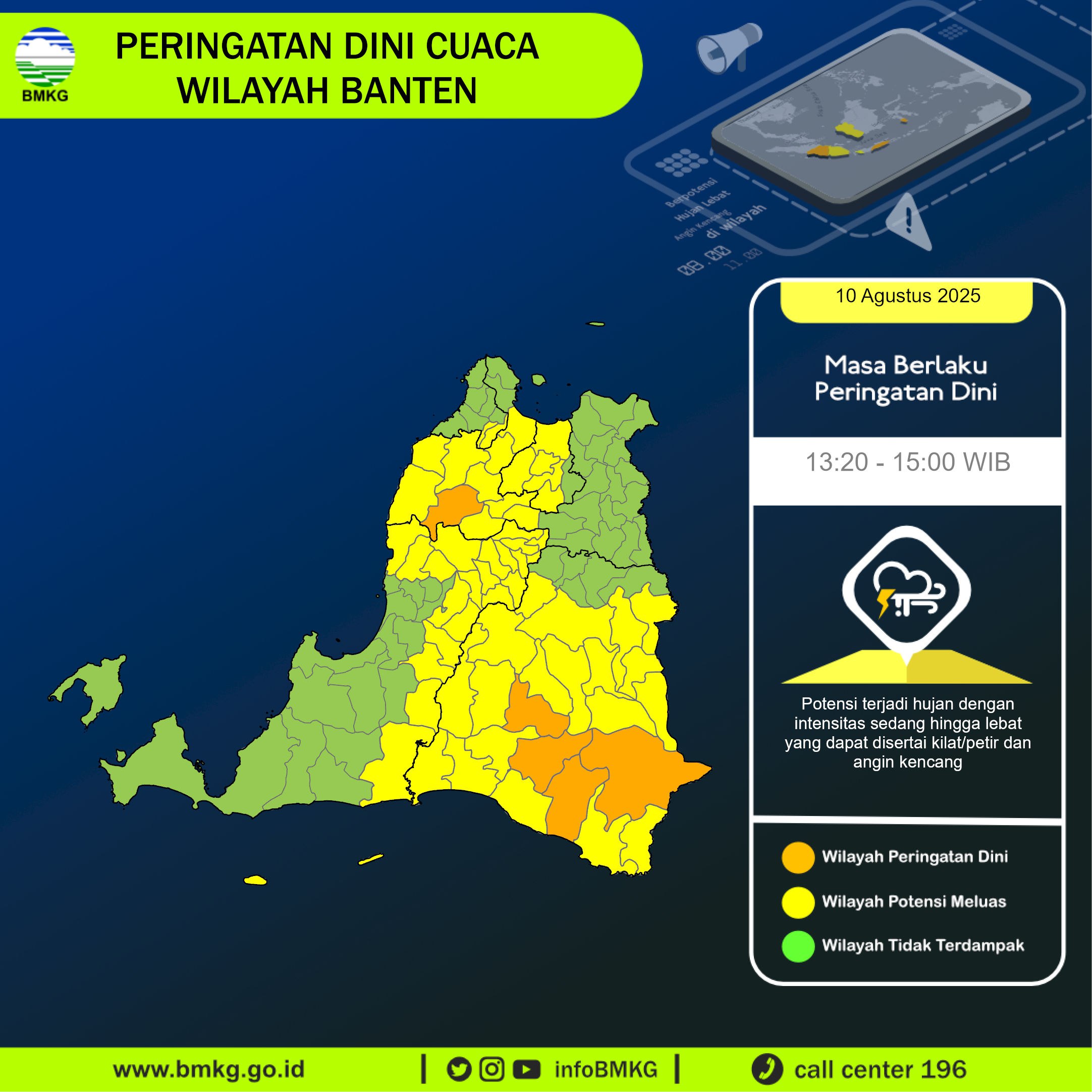 Peringatan Dini Cuaca Banten tgl 10 Agustus 2025 pkl 12:50 WIB berpotensi terjadi Hujan Sedang-Lebat yang dapat disertai Kilat/Petir dan Angin Kencang pada pkl. 13:20 WIB di