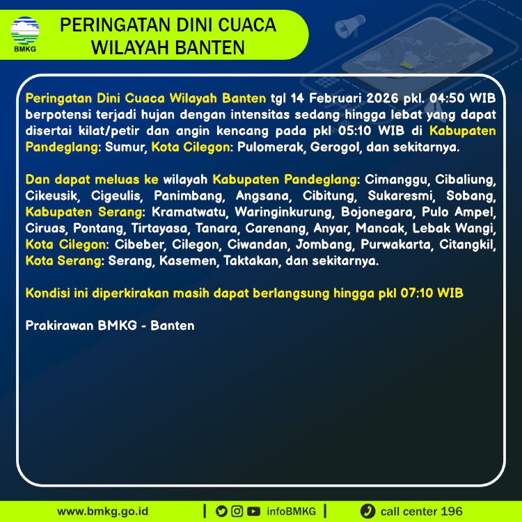Peringatan Dini Cuaca Banten tgl 14 Februari 2026 pkl 04:50 WIB berpotensi terjadi Hujan Sedang-Lebat yang dapat disertai Kilat/Petir dan Angin Kencang pada pkl. 05:10 WIB di