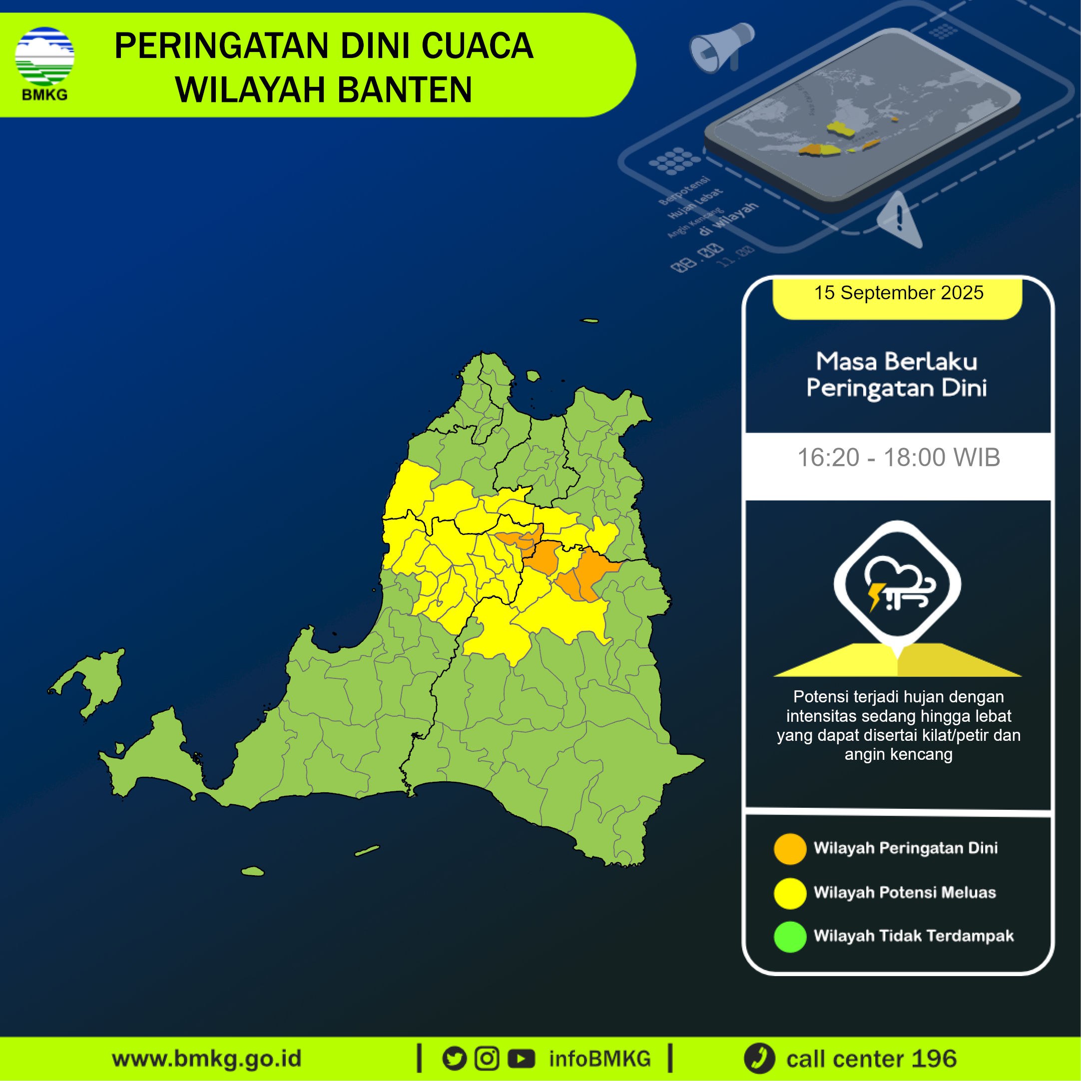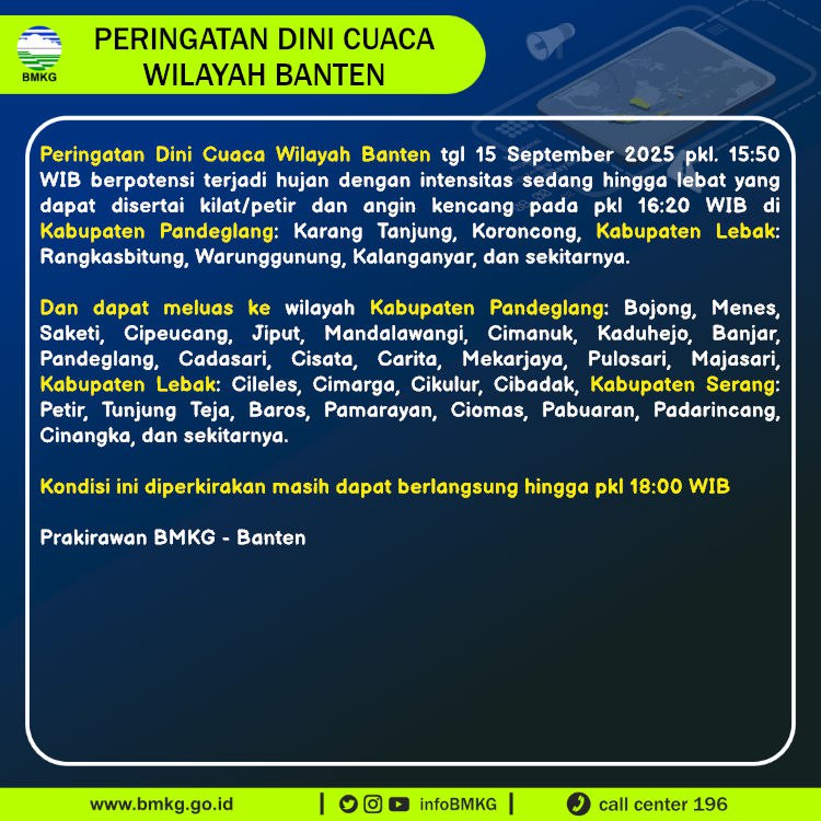 Peringatan Dini Cuaca Banten tgl 15 September 2025 pkl 15:50 WIB berpotensi terjadi Hujan Sedang-Lebat yang dapat disertai Kilat/Petir dan Angin Kencang pada pkl. 16:20 WIB di