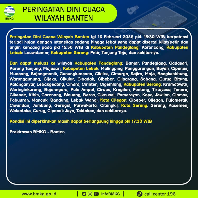 Peringatan Dini Cuaca Banten tgl 16 Februari 2026 pkl 15:30 WIB berpotensi terjadi Hujan Sedang-Lebat yang dapat disertai Kilat/Petir dan Angin Kencang pada pkl. 15:50 WIB di