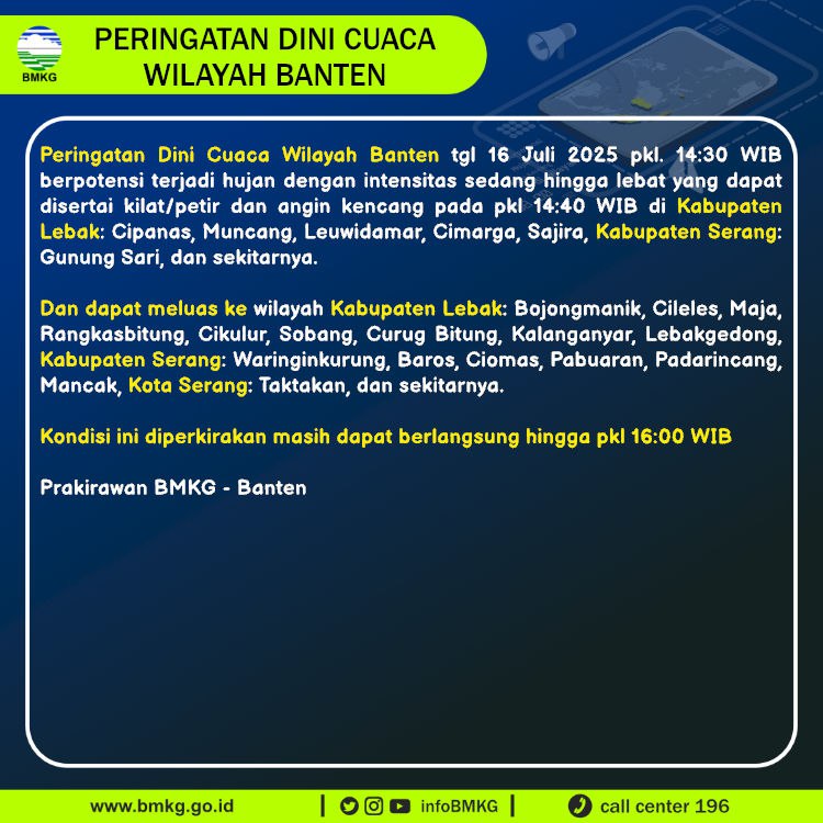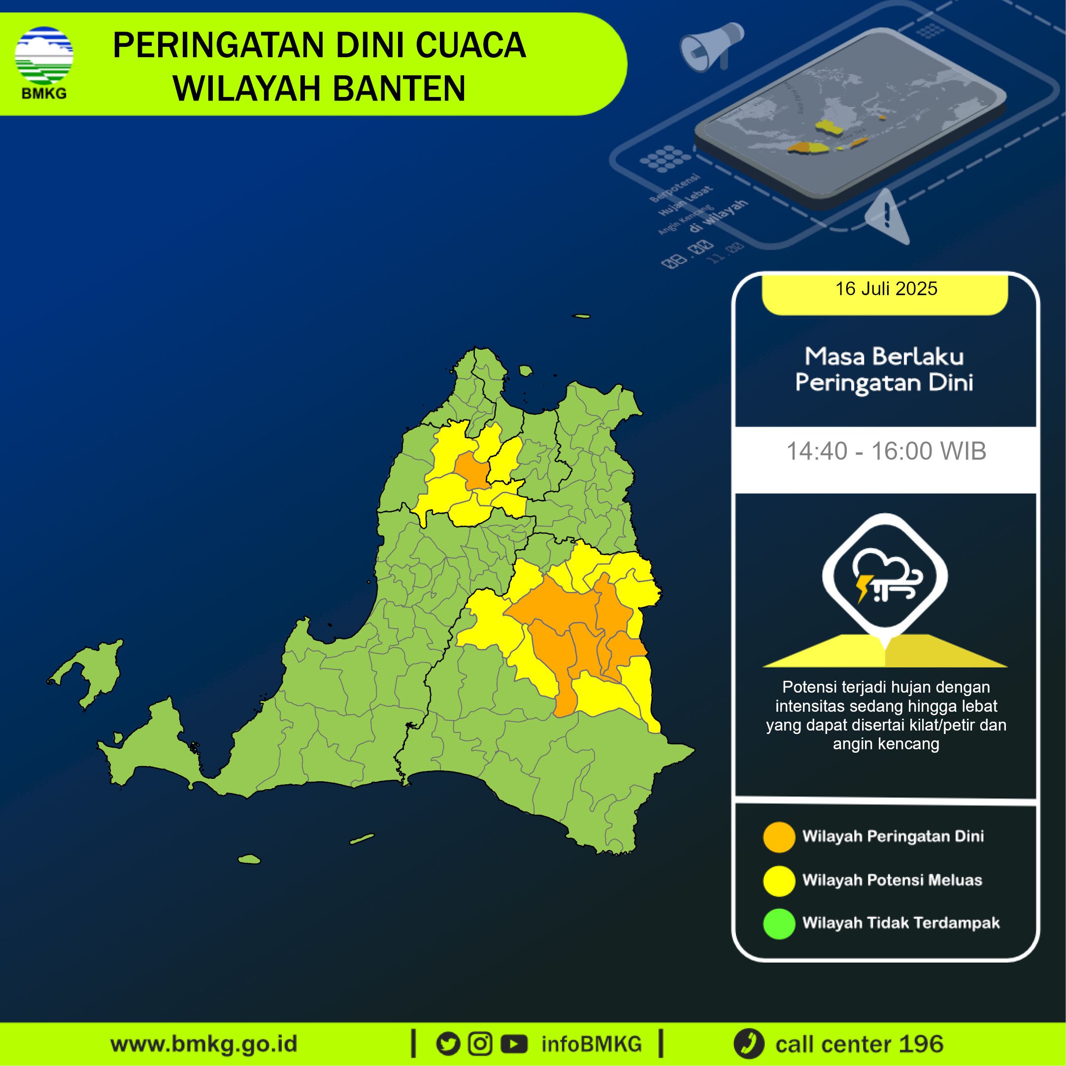 Peringatan Dini Cuaca Banten tgl 16 Juli 2025 pkl 14:30 WIB berpotensi terjadi Hujan Sedang-Lebat yang dapat disertai Kilat/Petir dan Angin Kencang pada pkl. 14:40 WIB di
