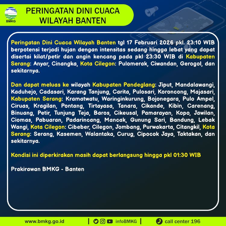 Peringatan Dini Cuaca Banten tgl 17 Februari 2026 pkl 23:10 WIB berpotensi terjadi Hujan Sedang-Lebat yang dapat disertai Kilat/Petir dan Angin Kencang pada pkl. 23:30 WIB di