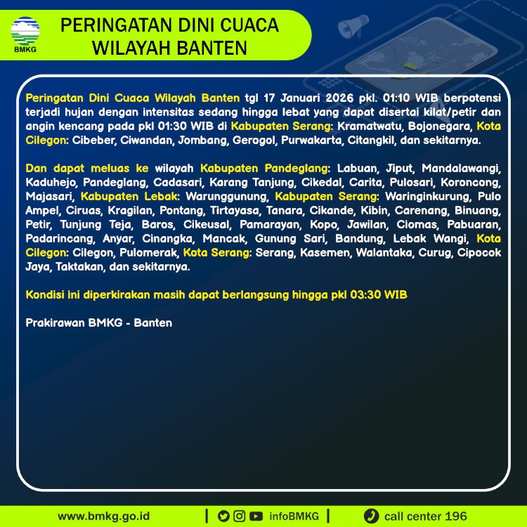 Peringatan Dini Cuaca Banten tgl 17 Januari 2026 pkl 01:10 WIB berpotensi terjadi Hujan Sedang-Lebat yang dapat disertai Kilat/Petir dan Angin Kencang pada pkl. 01:30 WIB di