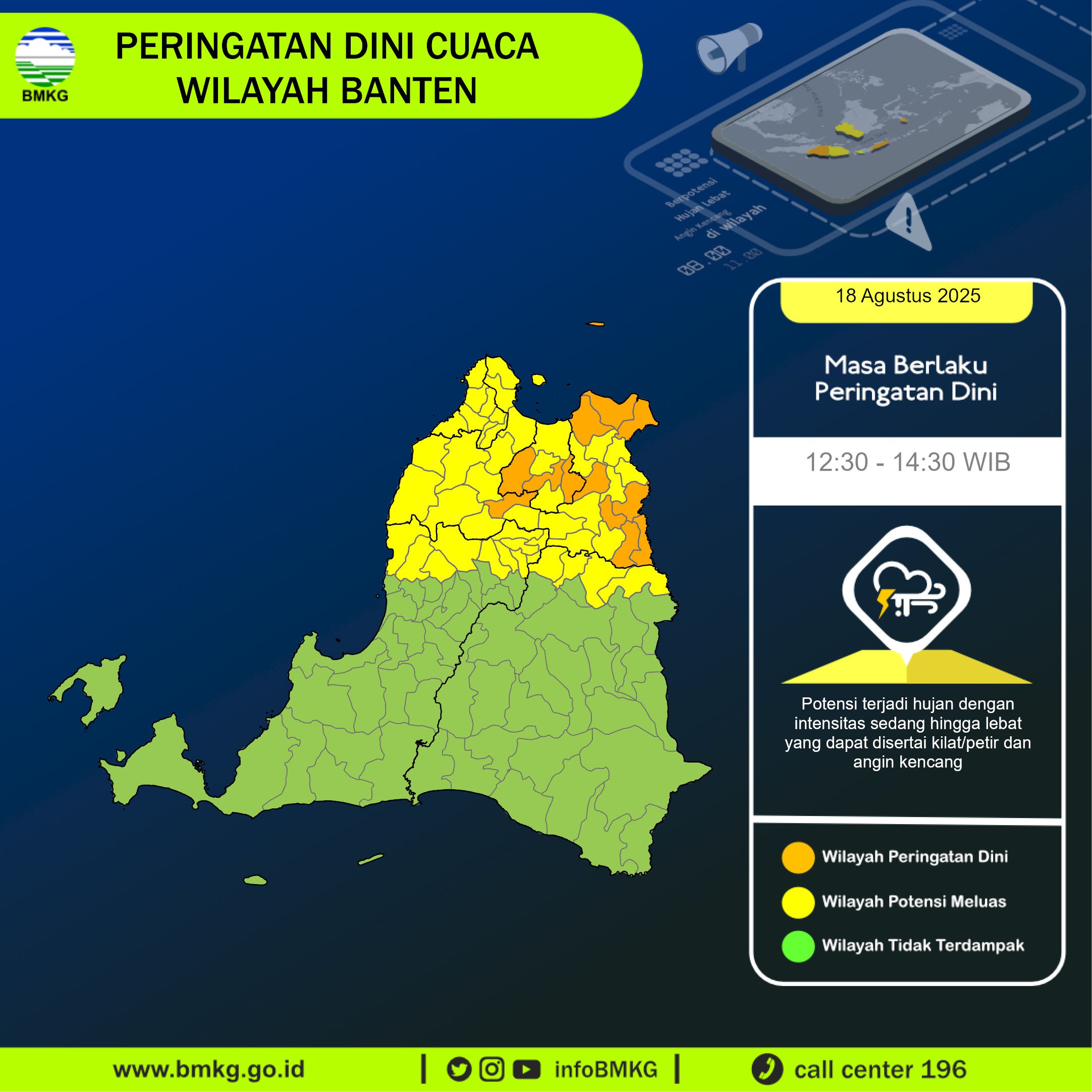 Peringatan Dini Cuaca Banten tgl 18 Agustus 2025 pkl 12:00 WIB berpotensi terjadi Hujan Sedang-Lebat yang dapat disertai Kilat/Petir dan Angin Kencang pada pkl. 12:30 WIB di
